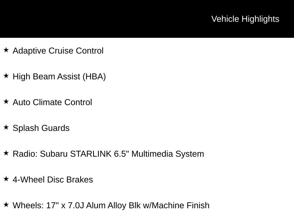 Subaru Certified Pre-Owned, EyeSight Driver-Assist System, X-Mode: Traction Management System, Apple CarPlay & Android Auto, SI-DRIVE Engine Performance Management, Bluetooth, Rear Vision Camera, Roof Rails, Adaptive Cruise Control, High Beam Assist (HBA), Auto Climate Control, Splash Guards, 4-Wheel Disc Brakes, Radio: Subaru STARLINK 6.5" Multimedia System, Wheels: 17" x 7.0J Alum Alloy Blk w/Machine Finish.