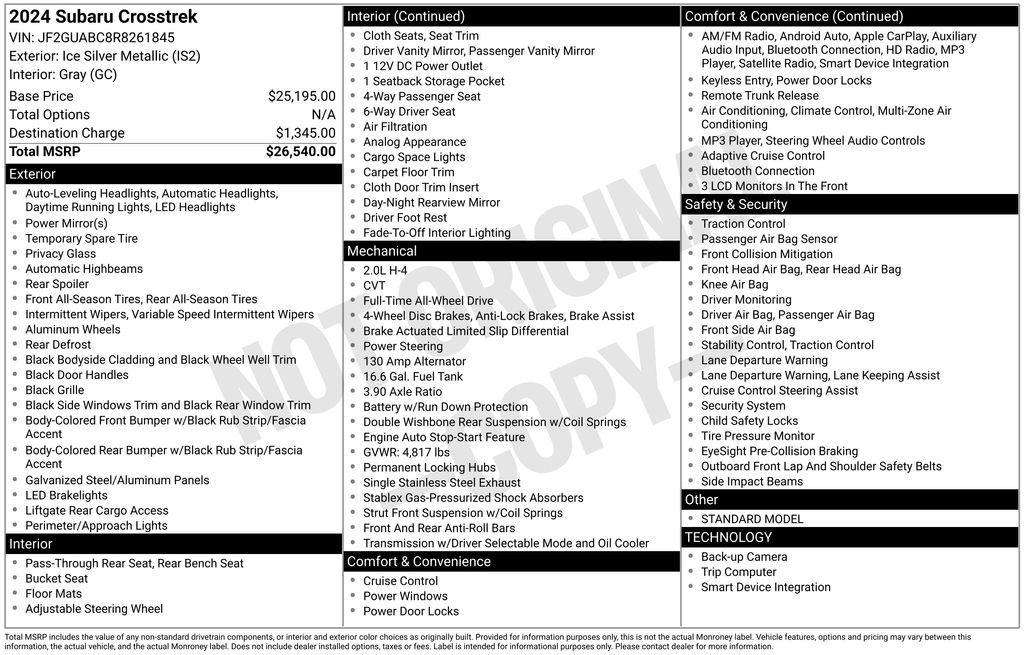 Oliver Subaru of Rutland is proud to present you with another True Market Priced Pre-Owned Vehicle. This 2024 Subaru Crosstrek Subaru Certified Pre-Owned is loaded with the following Factory Options: 4-Wheel Disc Brakes, Four wheel independent suspension, Radio: Subaru STARLINK Dual 7.0" Multimedia System, Steering wheel mounted audio controls, and Wheels: 17" x 7.0J Dark Gray Aluminum Alloy Standard Model, Subaru Certified Pre-Owned Certified, 4-Wheel Disc Brakes, Four wheel independent suspension, Radio: Subaru STARLINK Dual 7.0" Multimedia System, Steering wheel mounted audio controls, Wheels: 17" x 7.0J Dark Gray Aluminum Alloy, 4 Speakers, ABS brakes, Air Conditioning, Alloy wheels, AM/FM radio: SiriusXM, Anti-whiplash front head restraints, Auto High-beam Headlights, Automatic temperature control, Brake assist, Cloth Upholstery, Driver door bin, Driver vanity mirror, Dual front impact airbags, Dual front side impact airbags, Electronic Stability Control, Exterior Parking Camera Rear, Front anti-roll bar, Front Bucket Seats, Front Center Armrest, Front dual zone A/C, Front reading lights, Fully automatic headlights, Illuminated entry, Knee airbag, Low tire pressure warning, Occupant sensing airbag, Outside temperature display, Overhead airbag, Overhead console, Panic alarm, Passenger door bin, Passenger vanity mirror, Power door mirrors, Power steering, Power windows, Radio data system, Rear anti-roll bar, Rear window defroster, Rear window wiper, Remote keyless entry, Security system, Speed control, Speed-sensing steering, Split folding rear seat, Spoiler, STARLINK/Apple CarPlay/Android Auto, Tachometer, Telescoping steering wheel, Tilt steering wheel, Traction control, Trip computer, and Variably intermittent wipers!!