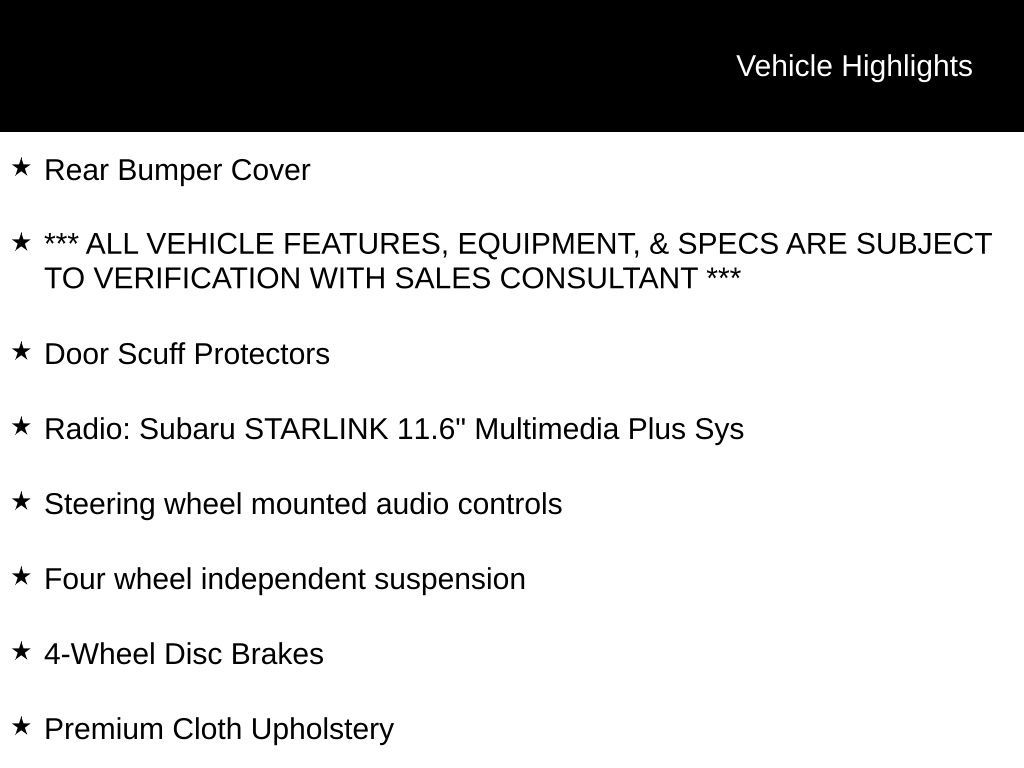Subaru Certified Pre-Owned, New Brakes!, EyeSight Driver-Assist System, X-Mode: Traction Management System, LED Steering Responsive Headlights (SRH), Apple CarPlay & Android Auto, SI-DRIVE Engine Performance Management, Bluetooth, Rear Vision Camera, Roof Rails, Adaptive Cruise Control, High Beam Assist (HBA), Auto Climate Control, Push-Button Start, LED Fog Lights, Splash Guards, Rear Bumper Cover, *** ALL VEHICLE FEATURES, EQUIPMENT, & SPECS ARE SUBJECT TO VERIFICATION WITH SALES CONSULTANT ***, Door Scuff Protectors, 4-Wheel Disc Brakes, Four wheel independent suspension, Premium Cloth Upholstery, Radio: Subaru STARLINK 11.6" Multimedia Plus Sys, Steering wheel mounted audio controls, Wheels: 17" x 7.0J Dark Gray Aluminum Alloy.