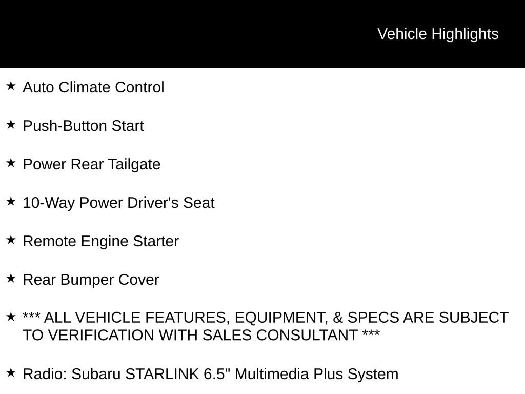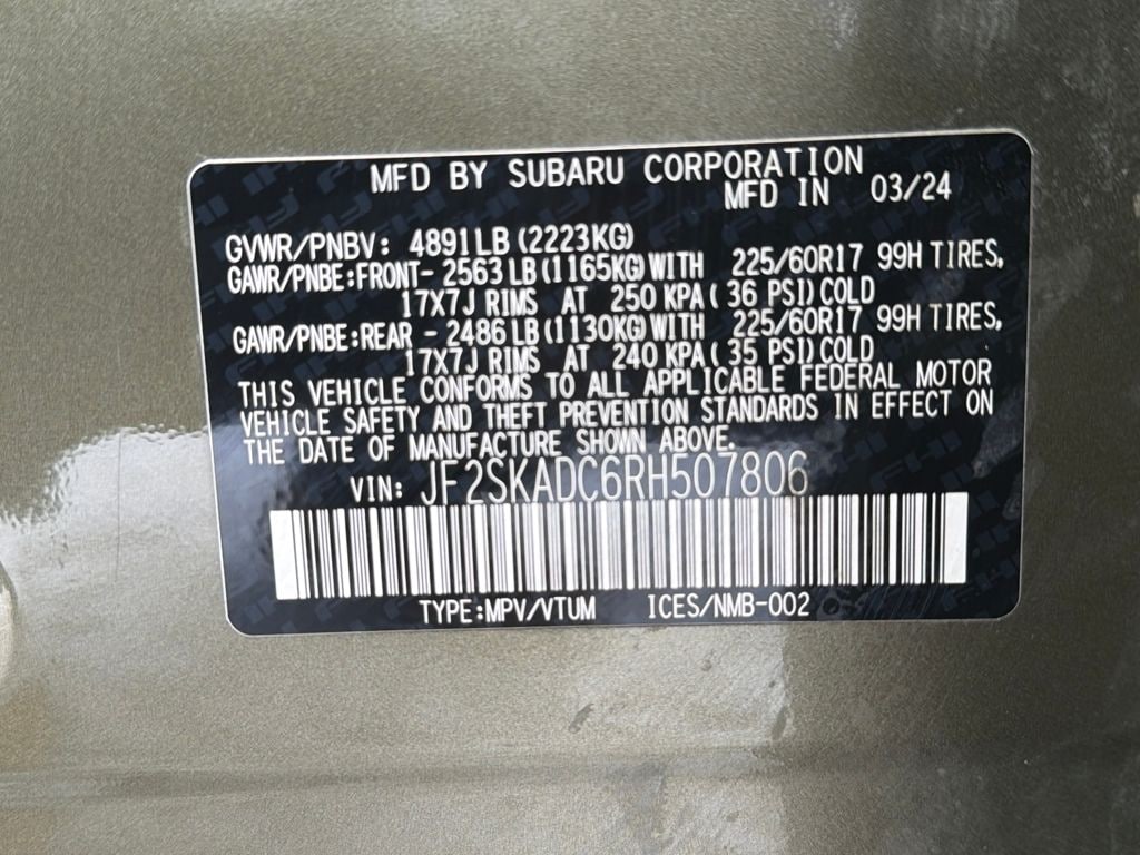 Subaru Certified Pre-Owned, New Brakes!, EyeSight Driver-Assist System, Panoramic Moonroof, X-Mode: Traction Management System, LED Steering Responsive Headlights (SRH), Apple CarPlay & Android Auto, SiriusXM Radio Capable, All-Weather Package (Heated Seats, Heated Mirrors, Wiper De-Icer), SI-DRIVE Engine Performance Management, Blind Spot Detection (BSD), Bluetooth, Rear Vision Camera, Roof Rails, Adaptive Cruise Control, High Beam Assist (HBA), Auto Climate Control, Push-Button Start, Power Rear Tailgate, 10-Way Power Driver's Seat, Remote Engine Starter, Rear Bumper Cover, *** ALL VEHICLE FEATURES, EQUIPMENT, & SPECS ARE SUBJECT TO VERIFICATION WITH SALES CONSULTANT ***, 4-Wheel Disc Brakes, Four wheel independent suspension, Radio: Subaru STARLINK 6.5" Multimedia Plus System, Steering wheel mounted audio controls, Wheels: 17" x 7.0 J Black Machine Finish Alloy.