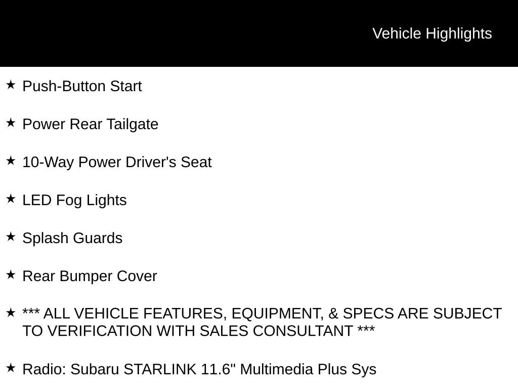 Subaru Certified Pre-Owned, New Brakes!, EyeSight Driver-Assist System, X-Mode: Traction Management System, LED Steering Responsive Headlights (SRH), Apple CarPlay & Android Auto, SiriusXM Radio Capable, All-Weather Package (Heated Seats, Heated Mirrors, Wiper De-Icer), Blind Spot Detection (BSD), Bluetooth, Rear Vision Camera, Integrated Roof Rack System, Auto-Dim Rear View Mirror w/ Homelink, Adaptive Cruise Control, High Beam Assist (HBA), Dual-Zone Auto Climate Control, Push-Button Start, Power Rear Tailgate, 10-Way Power Driver's Seat, LED Fog Lights, Splash Guards, Rear Bumper Cover, *** ALL VEHICLE FEATURES, EQUIPMENT, & SPECS ARE SUBJECT TO VERIFICATION WITH SALES CONSULTANT ***, 4-Wheel Disc Brakes, Four wheel independent suspension, Radio: Subaru STARLINK 11.6" Multimedia Plus Sys, Steering wheel mounted audio controls, Wheels: 17" x 7J Black Aluminum-Alloy.