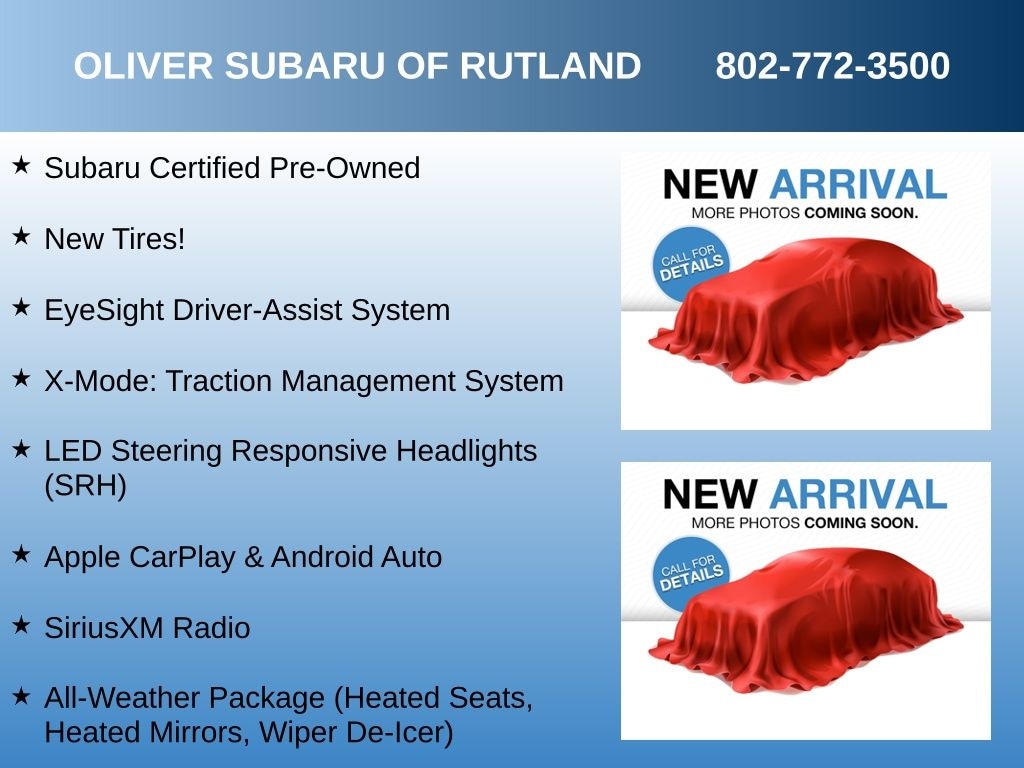Subaru Certified Pre-Owned, New Tires!, EyeSight Driver-Assist System, X-Mode: Traction Management System, LED Steering Responsive Headlights (SRH), Apple CarPlay & Android Auto, SiriusXM Radio, All-Weather Package (Heated Seats, Heated Mirrors, Wiper De-Icer), Blind Spot Detection (BSD), Bluetooth, Rear Vision Camera, Integrated Roof Rack System, Auto-Dim Rear View Mirror w/ Homelink, Adaptive Cruise Control, High Beam Assist (HBA), Dual-Zone Auto Climate Control, Push-Button Start, Power Rear Tailgate, 10-Way Power Driver's Seat, LED Fog Lights, Splash Guards, Rear Bumper Cover, 4-Wheel Disc Brakes, Radio: Subaru STARLINK 11.6" Multimedia Plus Sys.