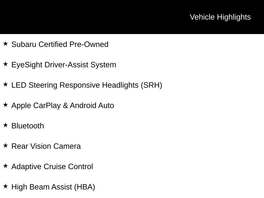 Subaru Certified Pre-Owned, EyeSight Driver-Assist System, LED Steering Responsive Headlights (SRH), Apple CarPlay & Android Auto, Bluetooth, Rear Vision Camera, Adaptive Cruise Control, High Beam Assist (HBA), Rear Bumper Applique, *** ALL VEHICLE FEATURES, EQUIPMENT, & SPECS ARE SUBJECT TO VERIFICATION WITH SALES CONSULTANT ***, 4-Wheel Disc Brakes, Four wheel independent suspension, Radio: Subaru Dual 7" Multimedia System, Steering wheel mounted audio controls, Wheels: 16" x 6.0" 1/2J Silver Aluminum Alloy.