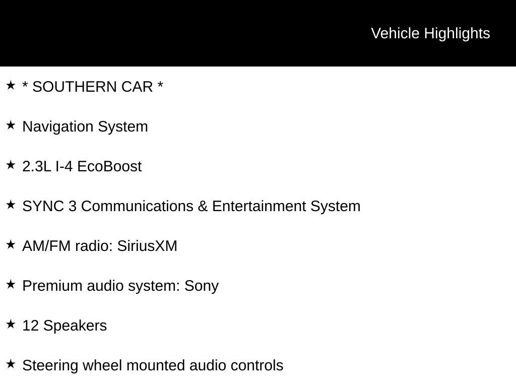Bluetooth, Heated and Ventilated Seats, Push-Button Start, 10-Way Power Driver's Seat w/ 2-Position Memory, Power Passenger Seat, LED Fog Lights, Remote Engine Starter, LED Signature Lighting, * SOUTHERN CAR *, 12 Speakers, 2.3L I-4 EcoBoost, 2nd Row Bucket Seats w/Power-Assist Fold, 3.39 Non-Limited-Slip Axle Ratio, 4-Wheel Disc Brakes, AM/FM radio: SiriusXM, Auto tilt-away steering wheel, Auto-dimming Rear-View mirror, Exterior Parking Camera Rear, Four wheel independent suspension, Fully automatic headlights, Heated steering wheel, Navigation System, Perforated Leather Heated/Cooled Bucket Seats, Power Liftgate, Premium audio system: Sony, Steering wheel mounted audio controls, SYNC 3 Communications & Entertainment System, Wheels: 20" Premium Luster Nickel-Painted Aluminum.