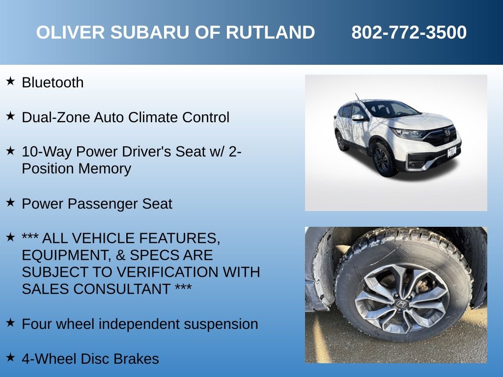 Oliver Subaru of Rutland is proud to present you with another True Market Priced Pre-Owned Vehicle. This 2020 Honda CR-V EX-L is loaded with the following Factory Options: AWD, 18" Alloy Wheels, 4-Wheel Disc Brakes, Adaptive Cruise Control: Adaptive Cruise Control (ACC) with Low-Speed Follow, Apple CarPlay/Android Auto, Auto High-beam Headlights, Auto-dimming Rear-View mirror, Blind Spot Information (BSI) System warning, Exterior Parking Camera Rear, Forward collision: Collision Mitigation Braking System (CMBS) + FCW mitigation, Four wheel independent suspension, Heated door mirrors, Power Liftgate, and Power moonroof AWD, 18" Alloy Wheels, 4-Wheel Disc Brakes, Adaptive Cruise Control: Adaptive Cruise Control (ACC) with Low-Speed Follow, Apple CarPlay/Android Auto, Auto High-beam Headlights, Auto-dimming Rear-View mirror, Blind Spot Information (BSI) System warning, Exterior Parking Camera Rear, Forward collision: Collision Mitigation Braking System (CMBS) + FCW mitigation, Four wheel independent suspension, Heated door mirrors, Power Liftgate, Power moonroof, 5.64 Axle Ratio, 8 Speakers, ABS brakes, Air Conditioning, Alloy wheels, AM/FM radio: SiriusXM, Automatic temperature control, Brake assist, Bumpers: body-color, Compass, Delay-off headlights, Driver door bin, Driver vanity mirror, Dual front impact airbags, Dual front side impact airbags, Electronic Stability Control, Front anti-roll bar, Front Bucket Seats, Front Center Armrest, Front dual zone A/C, Front fog lights, Front reading lights, Garage door transmitter: HomeLink, Heated Front Bucket Seats, Heated front seats, Illuminated entry, Leather Seat Trim, Leather Shift Knob, Low tire pressure warning, Memory seat, Occupant sensing airbag, Outside temperature display, Overhead airbag, Overhead console, Panic alarm, Passenger door bin, Passenger vanity mirror, Power door mirrors, Power driver seat, Power passenger seat, Power steering, Power windows, Radio data system, Radio: 180-Watt AM/FM/HD/SiriusXM Audio System, Rear anti-roll bar, Rear seat center armrest, Rear window defroster, Rear window wiper, Remote keyless entry, Security system, Speed control, Speed-sensing steering, Speed-Sensitive Wipers, Split folding rear seat, Spoiler, Steering wheel mounted audio controls, Tachometer, Telescoping steering wheel, Tilt steering wheel, Traction control, Trip computer, Turn signal indicator mirrors, and Variably intermittent wipers!!