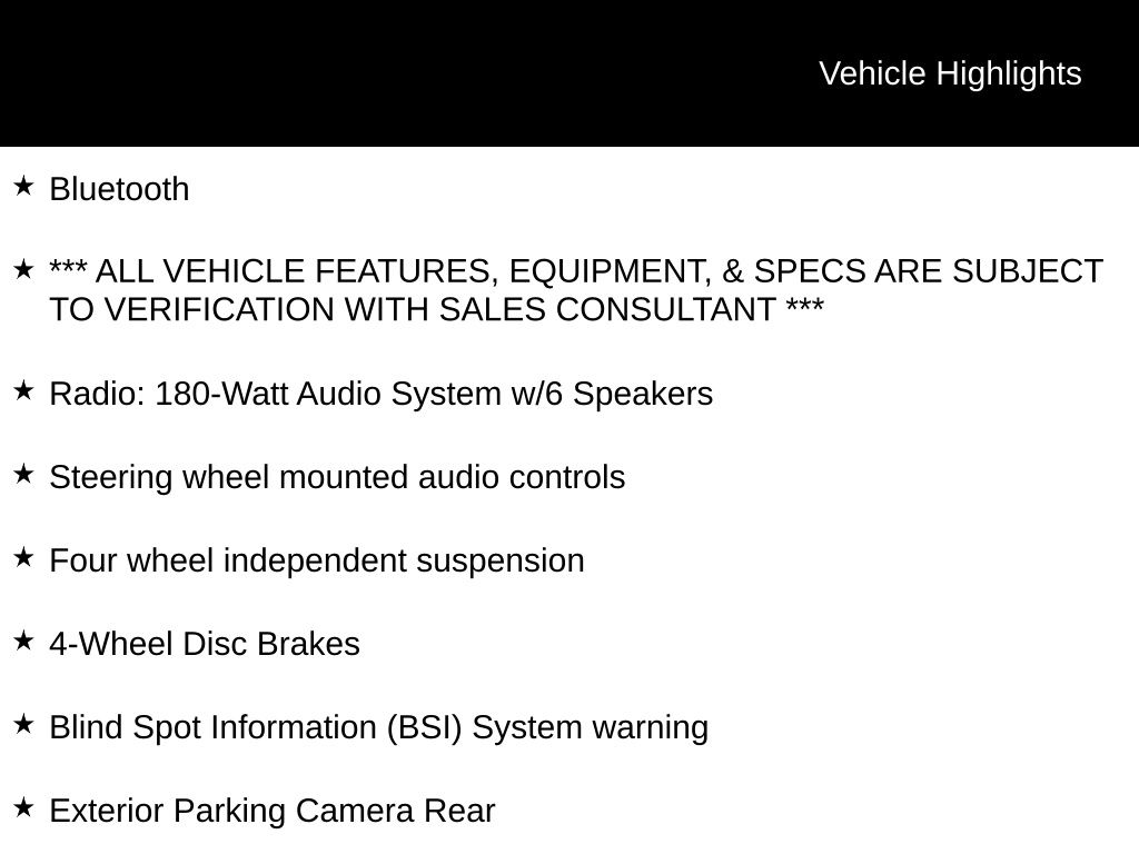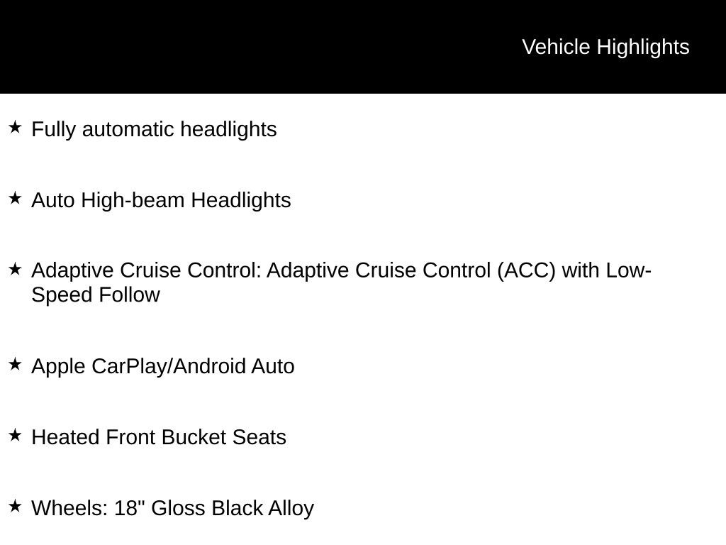 Bluetooth, *** ALL VEHICLE FEATURES, EQUIPMENT, & SPECS ARE SUBJECT TO VERIFICATION WITH SALES CONSULTANT ***, 4-Wheel Disc Brakes, Adaptive Cruise Control: Adaptive Cruise Control (ACC) with Low-Speed Follow, Apple CarPlay/Android Auto, Auto High-beam Headlights, Blind Spot Information (BSI) System warning, Exterior Parking Camera Rear, Four wheel independent suspension, Fully automatic headlights, Heated Front Bucket Seats, Radio: 180-Watt Audio System w/6 Speakers, Steering wheel mounted audio controls, Wheels: 18" Gloss Black Alloy.