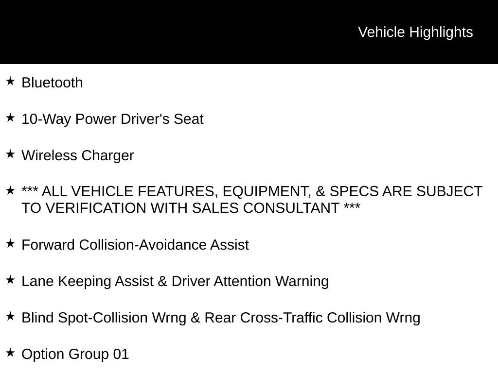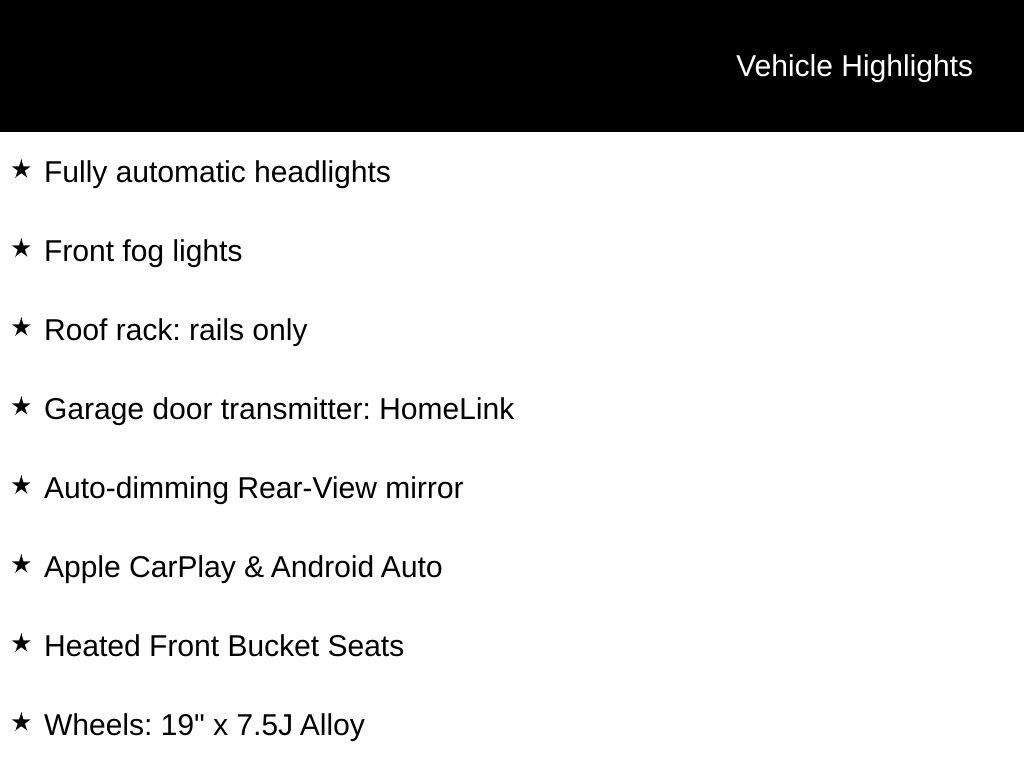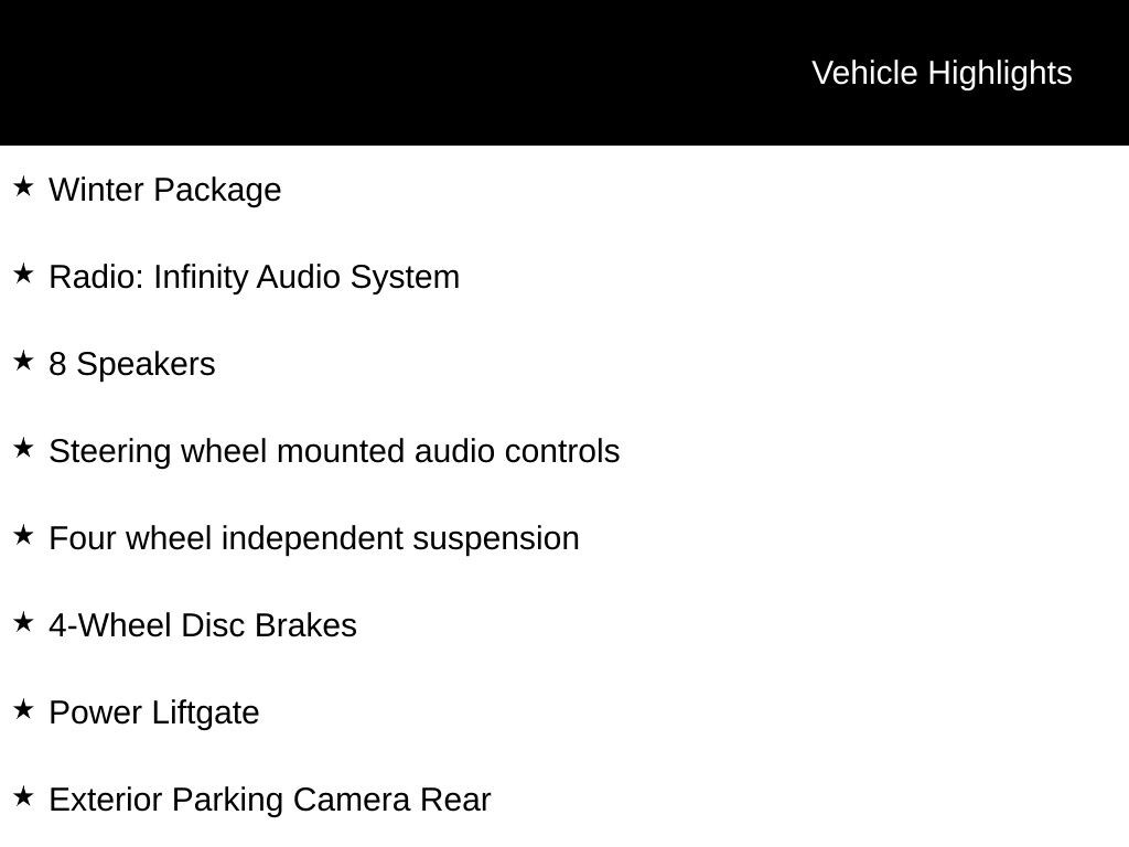 Bluetooth, 10-Way Power Driver's Seat, Wireless Charger, *** ALL VEHICLE FEATURES, EQUIPMENT, & SPECS ARE SUBJECT TO VERIFICATION WITH SALES CONSULTANT ***, Forward Collision-Avoidance Assist, Lane Keeping Assist & Driver Attention Warning, Blind Spot-Collision Wrng & Rear Cross-Traffic Collision Wrng, AWD, 4-Wheel Disc Brakes, 8 Speakers, Apple CarPlay & Android Auto, Auto-dimming Rear-View mirror, Exterior Parking Camera Rear, Four wheel independent suspension, Front fog lights, Fully automatic headlights, Garage door transmitter: HomeLink, Heated Front Bucket Seats, Option Group 01, Power Liftgate, Radio: Infinity Audio System, Roof rack: rails only, Steering wheel mounted audio controls, Wheels: 19" x 7.5J Alloy, Winter Package.