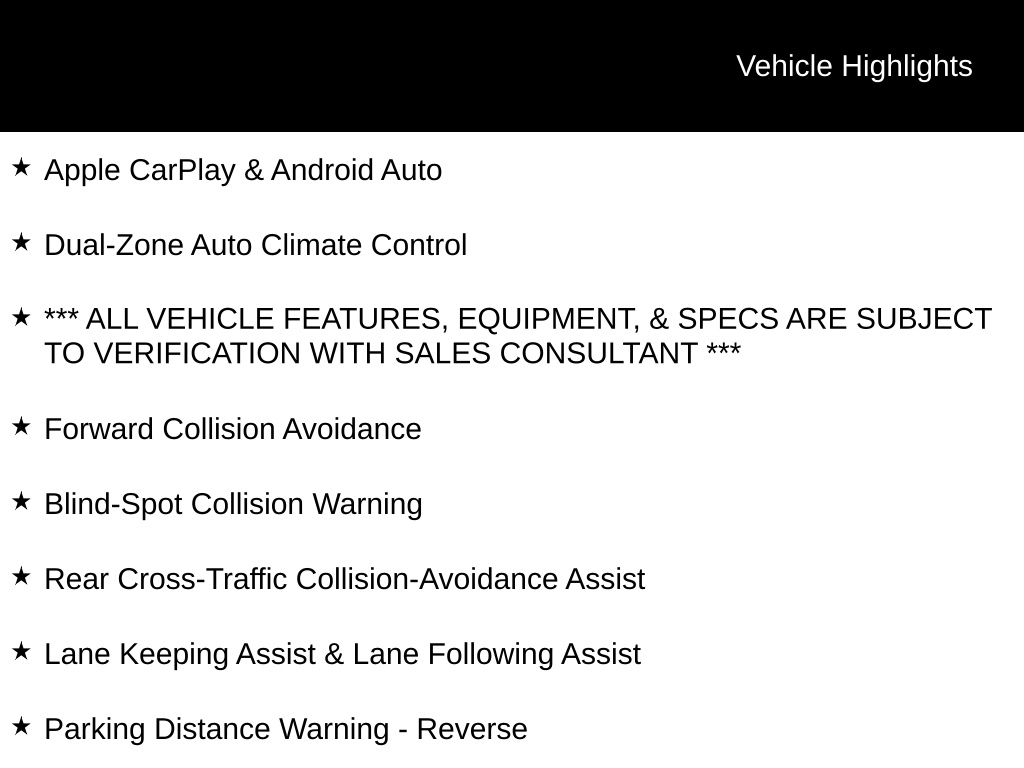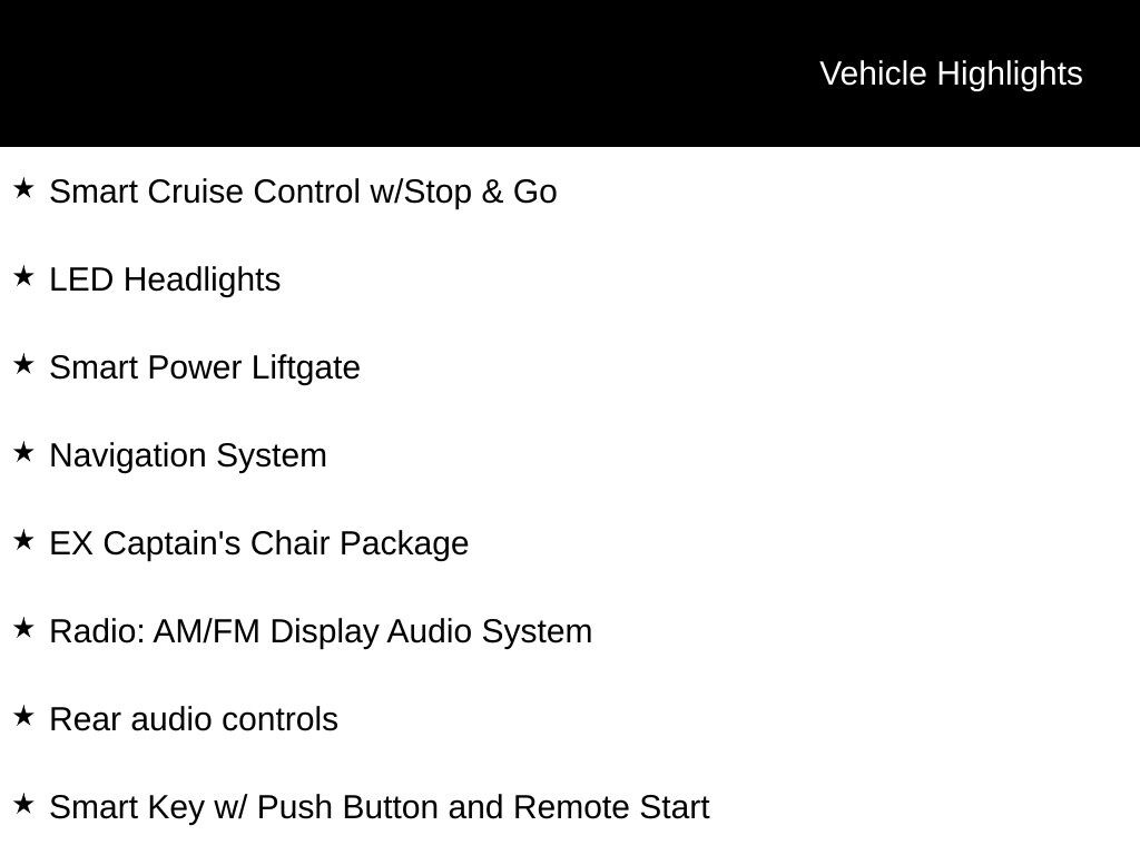 Apple CarPlay & Android Auto, Dual-Zone Auto Climate Control, *** ALL VEHICLE FEATURES, EQUIPMENT, & SPECS ARE SUBJECT TO VERIFICATION WITH SALES CONSULTANT ***, Forward Collision Avoidance, Blind-Spot Collision Warning, Rear Cross-Traffic Collision-Avoidance Assist, Lane Keeping Assist & Lane Following Assist, Parking Distance Warning - Reverse, Smart Cruise Control w/Stop & Go, LED Headlights, Smart Power Liftgate, 2nd Row Captain Chairs, 4-Wheel Disc Brakes, Active Cruise Control, Apple CarPlay & Android Auto, Auto High-beam Headlights, Auto-dimming Rear-View mirror, EX Captain's Chair Package, Exterior Parking Camera Rear, Four wheel independent suspension, Fully automatic headlights, Heated & Ventilated Front Bucket Seats, Heated door mirrors, Leather Seat Trim, Navigation System, Power moonroof, Power passenger seat, Radio: AM/FM Display Audio System, Rear audio controls, Reclining 3rd row seat, Remote keyless entry, Roof rack: rails only, Smart Key w/ Push Button and Remote Start, Steering wheel mounted audio controls, Wheels: 20" x 7.5" Black Finish.