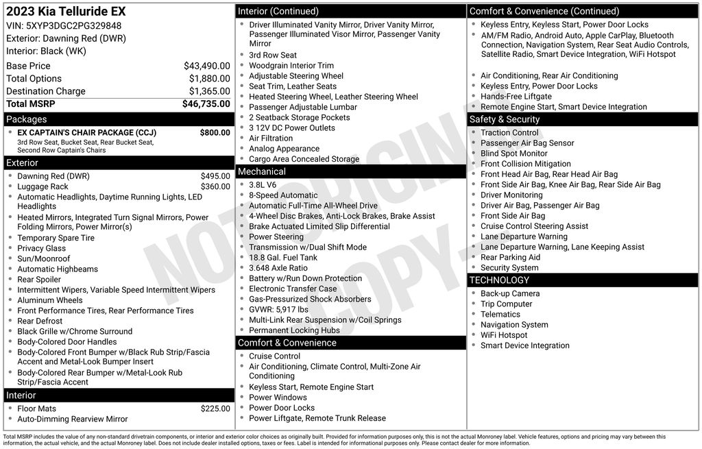 Oliver Subaru of Rutland is proud to present you with another True Market Priced Pre-Owned Vehicle. This 2023 Kia Telluride EX is loaded with the following Factory Options: EX Captain's Chair Package (2nd Row Captain Chairs), 4-Wheel Disc Brakes, Active Cruise Control, Apple CarPlay & Android Auto, Auto High-beam Headlights, Auto-dimming Rear-View mirror, Exterior Parking Camera Rear, Four wheel independent suspension, Fully automatic headlights, Heated & Ventilated Front Bucket Seats, Heated door mirrors, Leather Seat Trim, Navigation System, Power moonroof, Power passenger seat, Radio: AM/FM Display Audio System, Rear audio controls, Reclining 3rd row seat, Remote keyless entry, Roof rack: rails only, Smart Key w/ Push Button and Remote Start, Steering wheel mounted audio controls, and Wheels: 20" x 7.5" Black Finish EX Captain's Chair Package (2nd Row Captain Chairs), 4-Wheel Disc Brakes, Active Cruise Control, Apple CarPlay & Android Auto, Auto High-beam Headlights, Auto-dimming Rear-View mirror, Exterior Parking Camera Rear, Four wheel independent suspension, Fully automatic headlights, Heated & Ventilated Front Bucket Seats, Heated door mirrors, Leather Seat Trim, Navigation System, Power moonroof, Power passenger seat, Radio: AM/FM Display Audio System, Rear audio controls, Reclining 3rd row seat, Remote keyless entry, Roof rack: rails only, Smart Key w/ Push Button and Remote Start, Steering wheel mounted audio controls, Wheels: 20" x 7.5" Black Finish, 3rd row seats: split-bench, ABS brakes, Air Conditioning, Alloy wheels, Automatic temperature control, Brake assist, Compass, Driver door bin, Dual front impact airbags, Dual front side impact airbags, Electronic Stability Control, Front anti-roll bar, Front Center Armrest, Front dual zone A/C, Front reading lights, Heated front seats, Illuminated entry, Knee airbag, Leather Shift Knob, Leather steering wheel, Low tire pressure warning, Occupant sensing airbag, Outside temperature display, Overhead airbag, Overhead console, Panic alarm, Passenger vanity mirror, Power door mirrors, Rear air conditioning, Rear anti-roll bar, Rear reading lights, Rear seat center armrest, Rear side impact airbag, Rear window defroster, Rear window wiper, Security system, Speed control, Speed-sensing steering, Split folding rear seat, Spoiler, Tachometer, Telescoping steering wheel, Tilt steering wheel, Traction control, Trip computer, Turn signal indicator mirrors, and Variably intermittent wipers!!