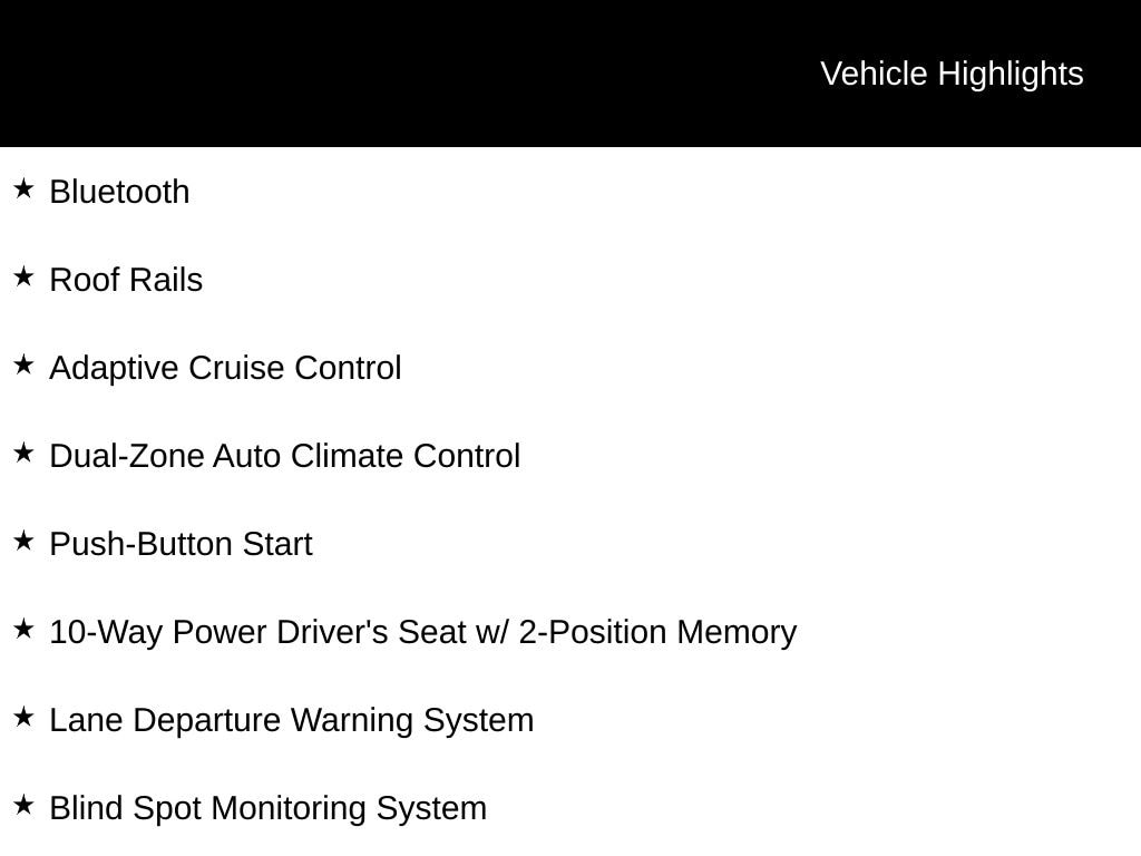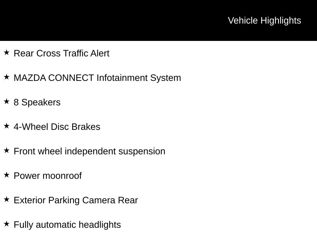 Bluetooth, Roof Rails, Adaptive Cruise Control, Dual-Zone Auto Climate Control, Push-Button Start, 10-Way Power Driver's Seat w/ 2-Position Memory, Lane Departure Warning System, Blind Spot Monitoring System, Rear Cross Traffic Alert, 4-Wheel Disc Brakes, 8 Speakers, AppLink/Apple CarPlay and Android Auto, Auto High-beam Headlights, Exterior Parking Camera Rear, Front wheel independent suspension, Fully automatic headlights, Heated Front Bucket Seats, MAZDA CONNECT Infotainment System, Power moonroof, Rain sensing wipers, Wheels: 18" x 7J Aluminum Alloy.