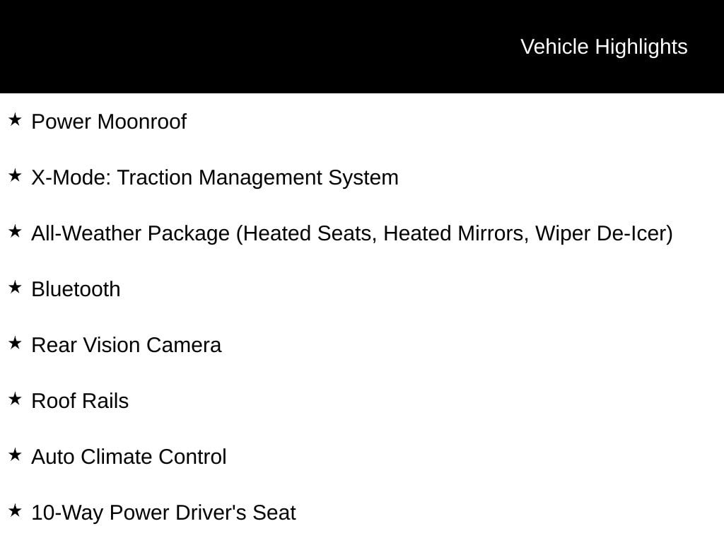 Power Moonroof, X-Mode: Traction Management System, All-Weather Package (Heated Seats, Heated Mirrors, Wiper De-Icer), Bluetooth, Rear Vision Camera, Roof Rails, Auto Climate Control, 10-Way Power Driver's Seat, Trailer Hitch, Splash Guards, Rear Bumper Cover, *** ALL VEHICLE FEATURES, EQUIPMENT, & SPECS ARE SUBJECT TO VERIFICATION WITH SALES CONSULTANT ***, 17" Alloy Wheels, 4-Wheel Disc Brakes, CD player, Four wheel independent suspension, Radio: Subaru Starlink 7.0" Multimedia Plus System, Steering wheel mounted audio controls.