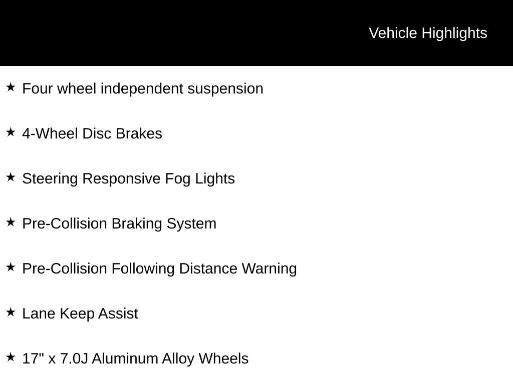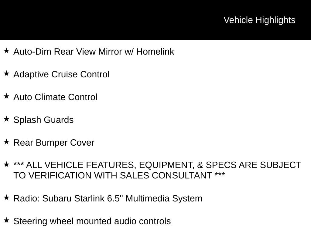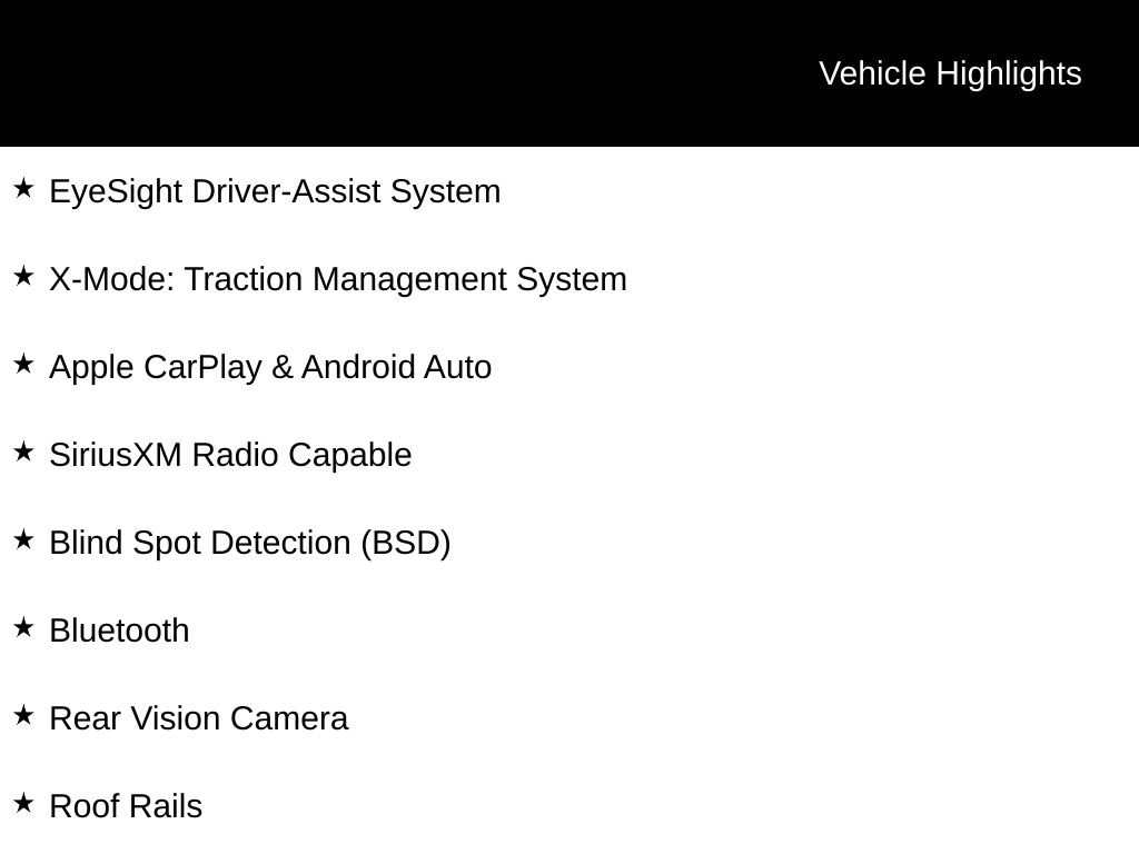 EyeSight Driver-Assist System, X-Mode: Traction Management System, Apple CarPlay & Android Auto, SiriusXM Radio Capable, Blind Spot Detection (BSD), Bluetooth, Rear Vision Camera, Roof Rails, Auto-Dim Rear View Mirror w/ Homelink, Adaptive Cruise Control, Auto Climate Control, Splash Guards, Rear Bumper Cover, *** ALL VEHICLE FEATURES, EQUIPMENT, & SPECS ARE SUBJECT TO VERIFICATION WITH SALES CONSULTANT ***, 17" x 7.0J Aluminum Alloy Wheels, 4-Wheel Disc Brakes, Four wheel independent suspension, Lane Keep Assist, Pre-Collision Braking System, Pre-Collision Following Distance Warning, Radio: Subaru Starlink 6.5" Multimedia System, Steering Responsive Fog Lights, Steering wheel mounted audio controls.