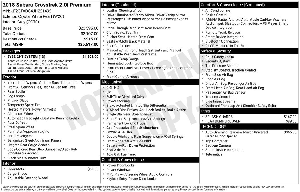 Oliver Subaru of Rutland is proud to present you with another True Market Priced Pre-Owned Vehicle. This 2018 Subaru Crosstrek 2.0i Premium is loaded with the following Factory Options: 17" x 7.0J Aluminum Alloy Wheels, 4-Wheel Disc Brakes, Four wheel independent suspension, Lane Keep Assist, Pre-Collision Braking System, Pre-Collision Following Distance Warning, Radio: Subaru Starlink 6.5" Multimedia System, Steering Responsive Fog Lights, and Steering wheel mounted audio controls EyeSight System (Blind Spot Detection/Rear Cross Traffic Alert), 17" x 7.0J Aluminum Alloy Wheels, 4-Wheel Disc Brakes, Four wheel independent suspension, Lane Keep Assist, Pre-Collision Braking System, Pre-Collision Following Distance Warning, Radio: Subaru Starlink 6.5" Multimedia System, Steering Responsive Fog Lights, Steering wheel mounted audio controls, 6 Speakers, ABS brakes, Adaptive Cruise Control, Air Conditioning, Alloy wheels, Apple CarPlay/Android Auto, Auto-Dimming Mirror w/Compass & HomeLink, Brake assist, Charge-Coupled Device Cameras, Driver door bin, Driver vanity mirror, Dual front impact airbags, Dual front side impact airbags, Electronic Stability Control, Emergency communication system: STARLINK, Exterior Parking Camera Rear, Front anti-roll bar, Front Bucket Seats, Front Center Armrest, Front fog lights, Front reading lights, Fully automatic headlights, Heated door mirrors, Illuminated entry, Knee airbag, Leather Shift Knob, Low tire pressure warning, Occupant sensing airbag, Outside temperature display, Overhead airbag, Overhead console, Panic alarm, Passenger door bin, Passenger vanity mirror, Power door mirrors, Power steering, Power windows, Pre-Collision Brake Assist, Rear anti-roll bar, Rear Bumper Cover, Rear window defroster, Rear window wiper, Remote keyless entry, Security system, Speed control, Speed-sensing steering, Split folding rear seat, Tachometer, Telescoping steering wheel, Tilt steering wheel, Traction control, Trip computer, and Variably intermittent wipers!!