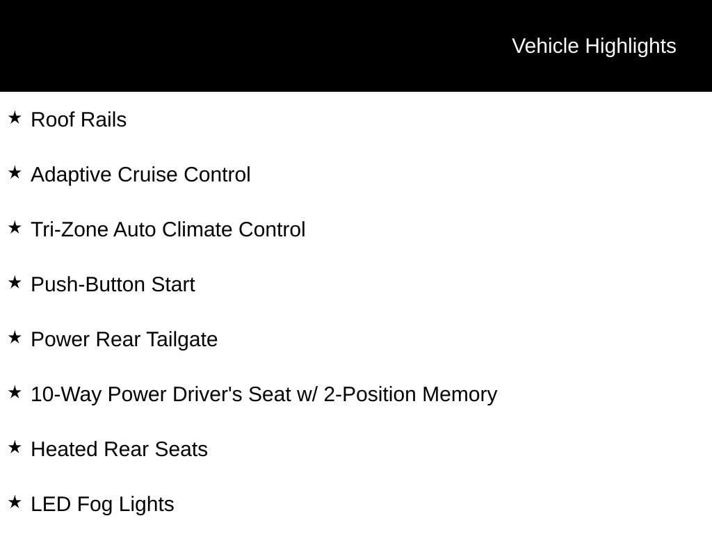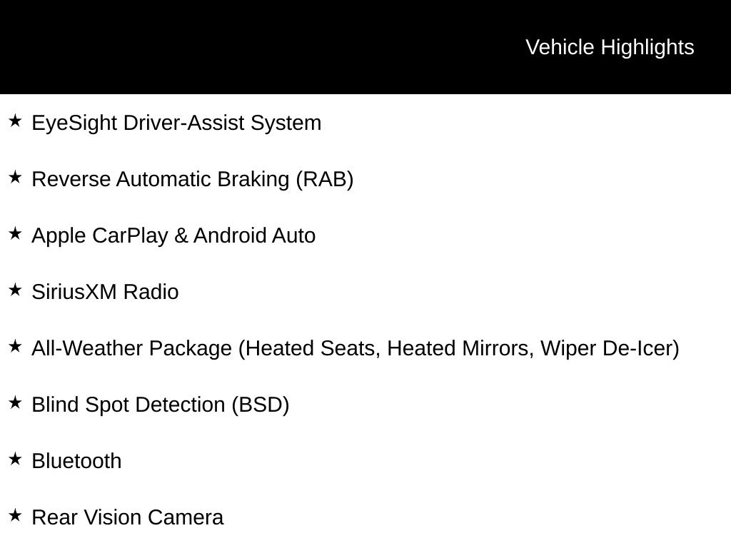 EyeSight Driver-Assist System, Reverse Automatic Braking (RAB), Apple CarPlay & Android Auto, SiriusXM Radio Capable, All-Weather Package (Heated Seats, Heated Mirrors, Wiper De-Icer), Blind Spot Detection (BSD), Bluetooth, Rear Vision Camera, Roof Rails, Adaptive Cruise Control, Tri-Zone Auto Climate Control, Push-Button Start, Power Rear Tailgate, 10-Way Power Driver's Seat w/ 2-Position Memory, Heated Rear Seats, LED Fog Lights, *** ALL VEHICLE FEATURES, EQUIPMENT, & SPECS ARE SUBJECT TO VERIFICATION WITH SALES CONSULTANT ***, 20" Alloy Wheels, 4-Wheel Disc Brakes, Auto-dimming Rear-View mirror, CD player, Four wheel independent suspension, Perforated Leather-Trimmed Upholstery, Radio: Subaru STARLINK 8.0" Multimedia Plus System, Steering wheel mounted audio controls.