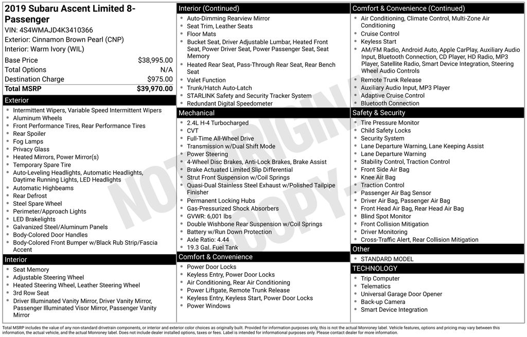 Oliver Subaru of Rutland is proud to present you with another True Market Priced Pre-Owned Vehicle. This 2019 Subaru Ascent Limited is loaded with the following Factory Options: 20" Alloy Wheels, 4-Wheel Disc Brakes, Auto-dimming Rear-View mirror, CD player, Four wheel independent suspension, Perforated Leather-Trimmed Upholstery, Radio: Subaru STARLINK 8.0" Multimedia Plus System, and Steering wheel mounted audio controls Standard Model, 20" Alloy Wheels, 4-Wheel Disc Brakes, Auto-dimming Rear-View mirror, CD player, Four wheel independent suspension, Perforated Leather-Trimmed Upholstery, Radio: Subaru STARLINK 8.0" Multimedia Plus System, Steering wheel mounted audio controls, 3rd row seats: bench, ABS brakes, Air Conditioning, Alloy wheels, Auto High-beam Headlights, Automatic temperature control, Axle Ratio: 4.44, Brake assist, Bumpers: body-color, Compass, Delay-off headlights, Driver door bin, Driver vanity mirror, Dual front impact airbags, Dual front side impact airbags, Electronic Stability Control, Emergency communication system: STARLINK Safety and Security, Exterior Parking Camera Rear, Front anti-roll bar, Front Bucket Seats, Front Center Armrest, Front dual zone A/C, Front fog lights, Front reading lights, Fully automatic headlights, Garage door transmitter: HomeLink, Heated door mirrors, Heated Front Bucket Seats, Heated front seats, Heated rear seats, Heated steering wheel, Illuminated entry, Knee airbag, Low tire pressure warning, Memory seat, Occupant sensing airbag, Outside temperature display, Overhead airbag, Overhead console, Panic alarm, Passenger door bin, Passenger vanity mirror, Power door mirrors, Power driver seat, Power Liftgate, Power passenger seat, Power steering, Power windows, Rear air conditioning, Rear anti-roll bar, Rear reading lights, Rear seat center armrest, Rear window defroster, Rear window wiper, Remote keyless entry, Roof rack: rails only, Security system, Speed control, Split folding rear seat, Spoiler, STARLINK/Apple CarPlay/Android Auto, Tachometer, Telescoping steering wheel, Tilt steering wheel, Traction control, Trip computer, and Variably intermittent wipers!!