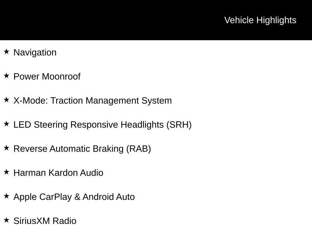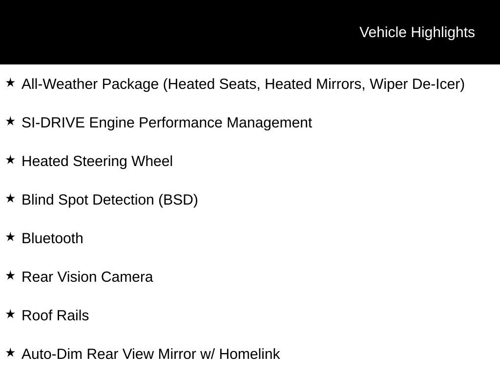 Navigation, Power Moonroof, X-Mode: Traction Management System, LED Steering Responsive Headlights (SRH), Reverse Automatic Braking (RAB), Harman Kardon Audio, Apple CarPlay & Android Auto, SiriusXM Radio, All-Weather Package (Heated Seats, Heated Mirrors, Wiper De-Icer), SI-DRIVE Engine Performance Management, Heated Steering Wheel, Blind Spot Detection (BSD), Bluetooth, Rear Vision Camera, Roof Rails, Auto-Dim Rear View Mirror w/ Homelink, Leather-Trimmed Seats, Adaptive Cruise Control, High Beam Assist (HBA), Auto Climate Control, Push-Button Start, 10-Way Power Driver's Seat, LED Fog Lights, Body Side Molding, Splash Guards, Rear Bumper Cover, 2.0L DOHC, 18" Alloy Wheels, 4-Wheel Disc Brakes, CD player, Four wheel independent suspension, Radio: Subaru Starlink 8.0" Multimedia Plus System, Steering wheel mounted audio controls.