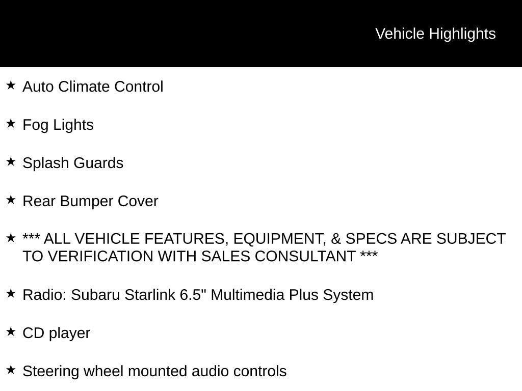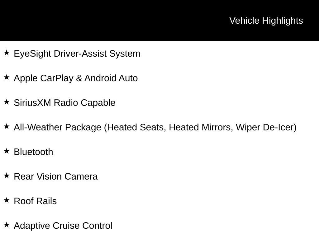 EyeSight Driver-Assist System, Apple CarPlay & Android Auto, SiriusXM Radio Capable, All-Weather Package (Heated Seats, Heated Mirrors, Wiper De-Icer), Bluetooth, Rear Vision Camera, Roof Rails, Adaptive Cruise Control, Auto Climate Control, Fog Lights, Splash Guards, Rear Bumper Cover, *** ALL VEHICLE FEATURES, EQUIPMENT, & SPECS ARE SUBJECT TO VERIFICATION WITH SALES CONSULTANT ***, 17" Alloy Wheels, 4-Wheel Disc Brakes, CD player, Four wheel independent suspension, Radio: Subaru Starlink 6.5" Multimedia Plus System, Steering wheel mounted audio controls.
