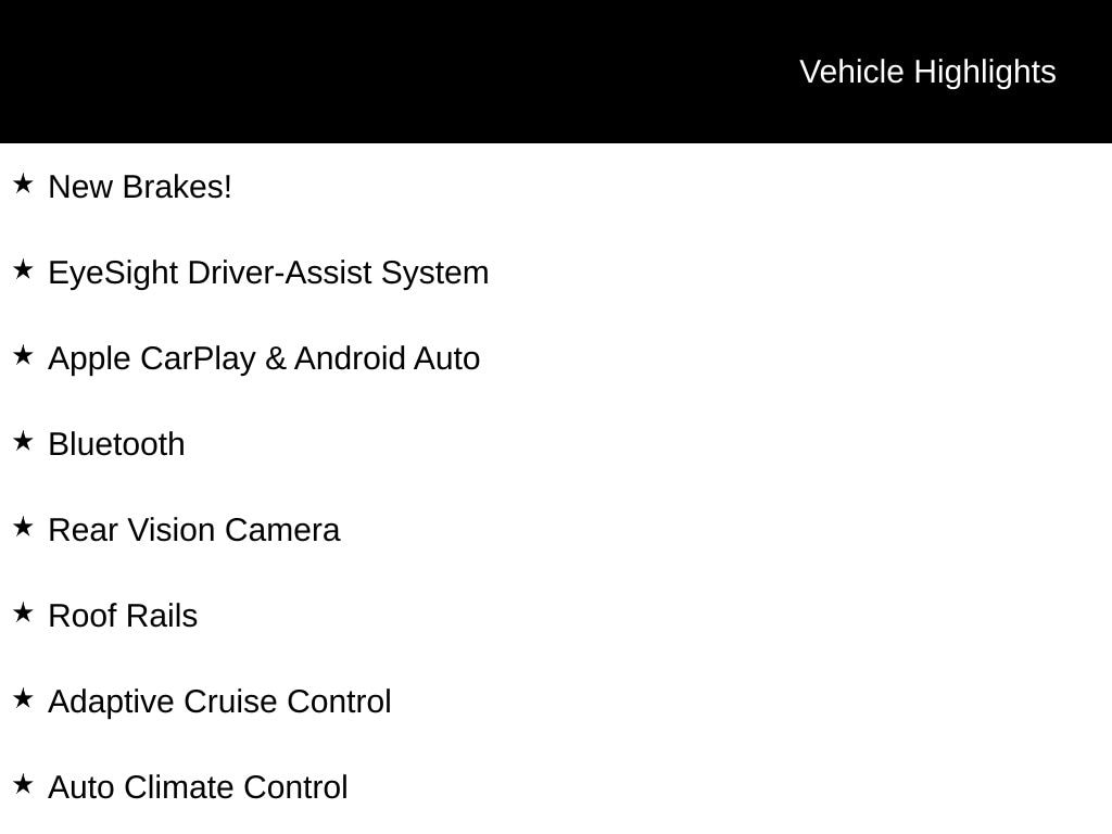 New Brakes!, EyeSight Driver-Assist System, Apple CarPlay & Android Auto, Bluetooth, Rear Vision Camera, Roof Rails, Adaptive Cruise Control, Auto Climate Control, LED Headlights, 4-Wheel Disc Brakes, CD player, Four wheel independent suspension, Radio: Subaru Starlink 6.5" Multimedia Plus System, Steering wheel mounted audio controls, Wheels: 17" x 7.0J Silver Finish Aluminum Alloy.
