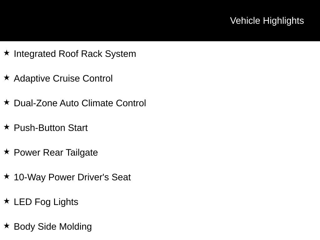 EyeSight Driver-Assist System, X-Mode: Traction Management System, Apple CarPlay & Android Auto, SiriusXM Radio, All-Weather Package (Heated Seats, Heated Mirrors, Wiper De-Icer), Blind Spot Detection (BSD), Bluetooth, Rear Vision Camera, Integrated Roof Rack System, Adaptive Cruise Control, Dual-Zone Auto Climate Control, Push-Button Start, Power Rear Tailgate, 10-Way Power Driver's Seat, LED Fog Lights, Body Side Molding, Splash Guards, Rear Bumper Cover, 4-Wheel Disc Brakes, Four wheel independent suspension, Radio: Subaru STARLINK 11.6" Multimedia Plus Sys, Steering wheel mounted audio controls, Steering Wheel Paddle Shift Control Switches, Wheels: 17" x 7J Black Aluminum Alloy.