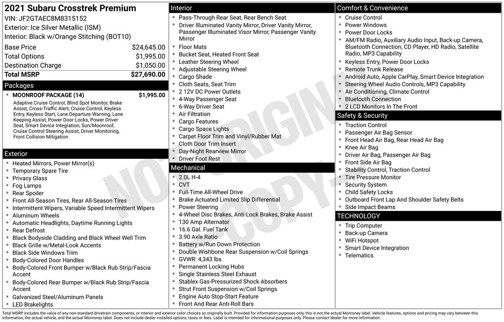 Oliver Subaru of Rutland is proud to present you with another True Market Priced Pre-Owned Vehicle. This 2021 Subaru Crosstrek Premium is loaded with the following Factory Options: 17" Alloy Wheels, 4-Wheel Disc Brakes, CD player, Four wheel independent suspension, Radio: Subaru STARLINK 6.5" Multimedia Plus System, and Steering wheel mounted audio controls Moonroof Package (6-Way Power Driver's Seat, Blind Spot Detection (BSD), EyeSight System, Keyless Access w/Push-Button Start, and Power Moonroof), 17" Alloy Wheels, 4-Wheel Disc Brakes, CD player, Four wheel independent suspension, Radio: Subaru STARLINK 6.5" Multimedia Plus System, Steering wheel mounted audio controls, 6 Speakers, ABS brakes, Air Conditioning, Alloy wheels, AM/FM radio: SiriusXM, Anti-whiplash front head restraints, Automatic temperature control, Brake assist, Cloth Upholstery, Driver door bin, Driver vanity mirror, Dual front impact airbags, Dual front side impact airbags, Electronic Stability Control, Emergency communication system: STARLINK Safety and Security (Subscription Required), Exterior Parking Camera Rear, Front anti-roll bar, Front Bucket Seats, Front Center Armrest, Front fog lights, Front reading lights, Fully automatic headlights, Heated door mirrors, Heated Front Bucket Seats, Heated front seats, Illuminated entry, Knee airbag, Leather Shift Knob, Low tire pressure warning, Occupant sensing airbag, Outside temperature display, Overhead airbag, Overhead console, Panic alarm, Passenger door bin, Passenger vanity mirror, Power door mirrors, Power steering, Power windows, Radio data system, Rear anti-roll bar, Rear window defroster, Rear window wiper, Remote keyless entry, Security system, Speed control, Speed-sensing steering, Split folding rear seat, Spoiler, STARLINK/Apple CarPlay/Android Auto, Tachometer, Telescoping steering wheel, Tilt steering wheel, Traction control, Trip computer, and Variably intermittent wipers!!