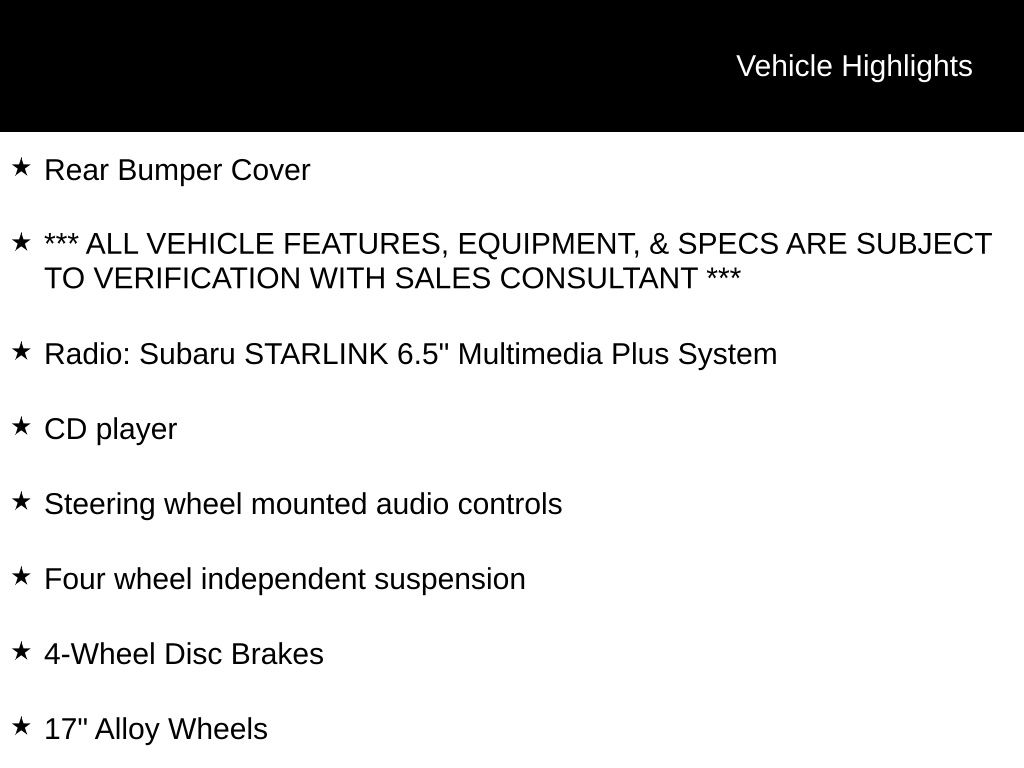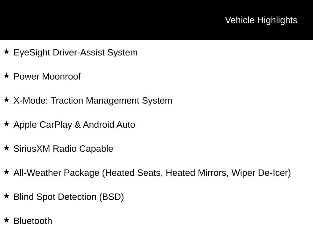 EyeSight Driver-Assist System, Power Moonroof, X-Mode: Traction Management System, Apple CarPlay & Android Auto, SiriusXM Radio Capable, All-Weather Package (Heated Seats, Heated Mirrors, Wiper De-Icer), Blind Spot Detection (BSD), Bluetooth, Rear Vision Camera, Roof Rails, Adaptive Cruise Control, Auto Climate Control, Push-Button Start, 6-Way Power Driver's Seat, Fog Lights, Splash Guards, Rear Bumper Cover, *** ALL VEHICLE FEATURES, EQUIPMENT, & SPECS ARE SUBJECT TO VERIFICATION WITH SALES CONSULTANT ***, 17" Alloy Wheels, 4-Wheel Disc Brakes, CD player, Four wheel independent suspension, Radio: Subaru STARLINK 6.5" Multimedia Plus System, Steering wheel mounted audio controls.