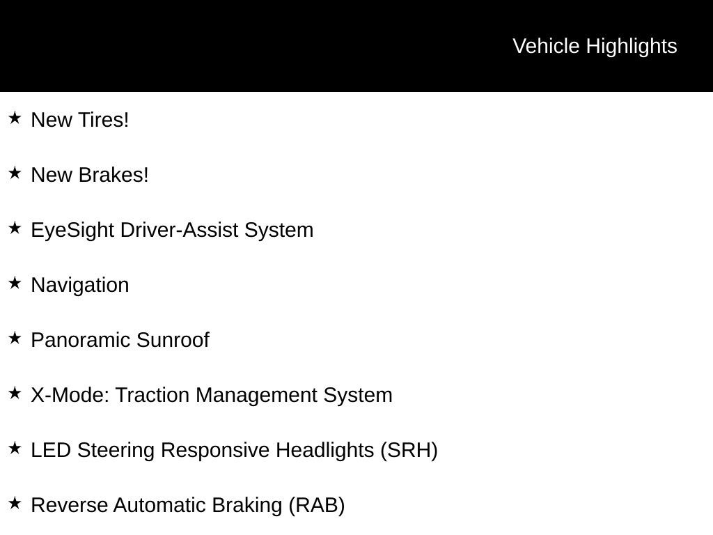 New Tires!, New Brakes!, EyeSight Driver-Assist System, Navigation, Panoramic Sunroof, X-Mode: Traction Management System, LED Steering Responsive Headlights (SRH), Reverse Automatic Braking (RAB), Harman Kardon Audio, Apple CarPlay & Android Auto, SiriusXM Radio, All-Weather Package (Heated Seats, Heated Mirrors, Wiper De-Icer), Heated Steering Wheel, Blind Spot Detection (BSD), Bluetooth, Rear Vision Camera, Leather-Trimmed Seats, Adaptive Cruise Control, High Beam Assist (HBA), Dual-Zone Auto Climate Control, Push-Button Start, Power Rear Tailgate, 10-Way Power Driver's Seat w/ 2-Position Memory, Power Passenger Seat, Heated Rear Seats, Alloy Wheels, Splash Guards, Rear Bumper Cover, 4-Wheel Disc Brakes, CD player, Four wheel independent suspension, Paddle-Shift Control Switches, Radio: Subaru Starlink 8.0" Multimedia Nav System, Steering wheel mounted audio controls, Wheels: 18" x 7.0J Blk Machine Touring Alum Alloy.