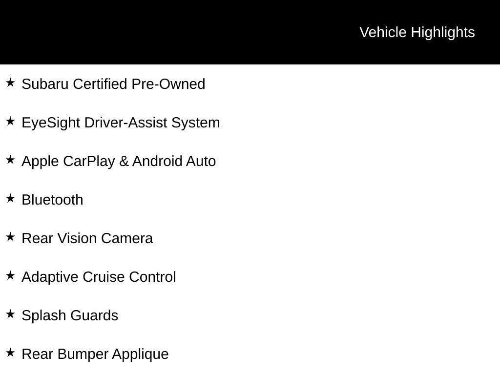 Subaru Certified Pre-Owned, EyeSight Driver-Assist System, Apple CarPlay & Android Auto, Bluetooth, Rear Vision Camera, Adaptive Cruise Control, Splash Guards, Rear Bumper Applique, Door Scuff Protectors, 4-Wheel Disc Brakes, Four wheel independent suspension, Radio: Subaru STARLINK 6.5" Multimedia System, Wheels: 16" x 6.5" Black Finish J Steel.