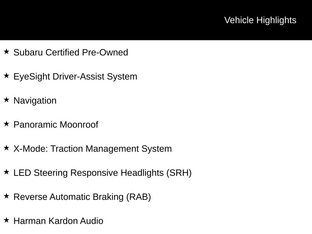 Subaru Certified Pre-Owned, EyeSight Driver-Assist System, Navigation, Panoramic Moonroof, X-Mode: Traction Management System, LED Steering Responsive Headlights (SRH), Reverse Automatic Braking (RAB), Harman Kardon Audio, Apple CarPlay & Android Auto, SiriusXM Radio Capable, All-Weather Package (Heated Seats, Heated Mirrors, Wiper De-Icer), Heated Steering Wheel, Blind Spot Detection (BSD), Bluetooth, Rear Vision Camera, Roof Rails, Auto Climate Control, Push-Button Start, Power Rear Tailgate, 10-Way Power Driver's Seat, Fog Lights, *** ALL VEHICLE FEATURES, EQUIPMENT, & SPECS ARE SUBJECT TO VERIFICATION WITH SALES CONSULTANT ***, 4-Wheel Disc Brakes, CD player, Four wheel independent suspension, harman/kardon 9-Speaker Audio System, Radio: Subaru Starlink 8.0" Multimedia Nav System, Steering wheel mounted audio controls, Wheels: 18" x 7.0 J Black Machine Finish Alloy.