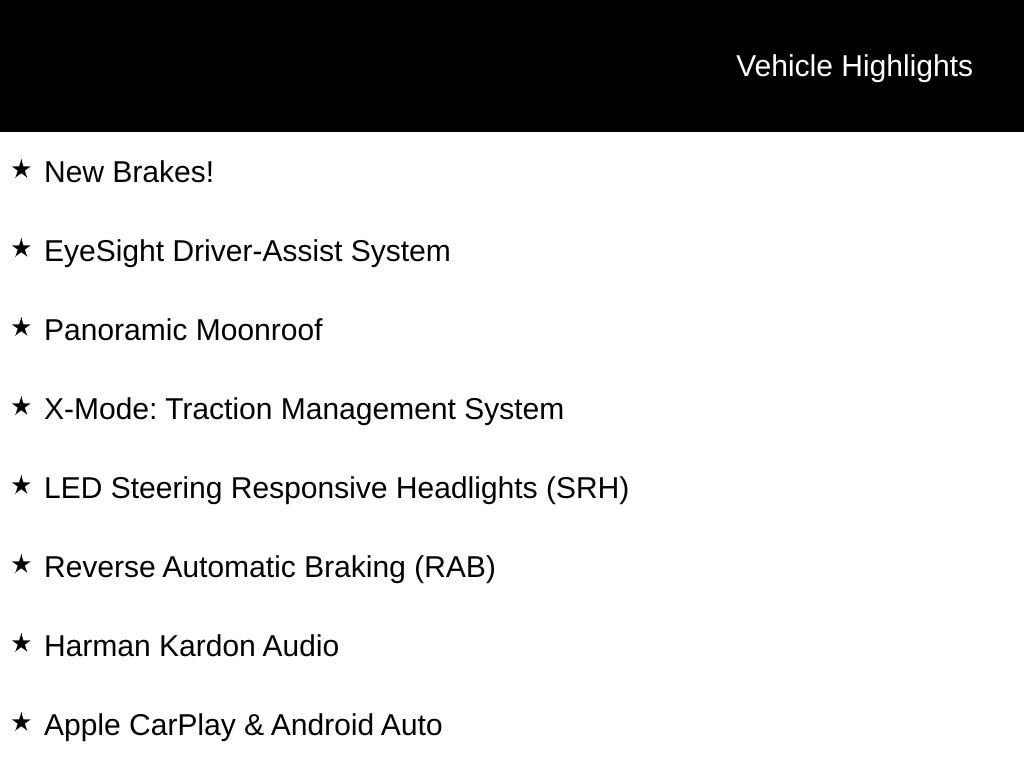 New Brakes!, EyeSight Driver-Assist System, Panoramic Moonroof, X-Mode: Traction Management System, LED Steering Responsive Headlights (SRH), Reverse Automatic Braking (RAB), Harman Kardon Audio, Apple CarPlay & Android Auto, SiriusXM Radio Capable, All-Weather Package (Heated Seats, Heated Mirrors, Wiper De-Icer), SI-DRIVE Engine Performance Management, Blind Spot Detection (BSD), Bluetooth, Rear Vision Camera, Roof Rails, Adaptive Cruise Control, High Beam Assist (HBA), Auto Climate Control, Push-Button Start, Power Rear Tailgate, 10-Way Power Driver's Seat, LED Fog Lights, Body Side Molding, Rear Bumper Cover, *** ALL VEHICLE FEATURES, EQUIPMENT, & SPECS ARE SUBJECT TO VERIFICATION WITH SALES CONSULTANT ***, Footwell Illumination Kit, 4-Wheel Disc Brakes, CD player, Four wheel independent suspension, harman/kardon 9-Speaker Audio System, Radio: Subaru Starlink 8.0" Multimedia Plus System, Sport Cloth Upholstery, Steering wheel mounted audio controls, Wheels: 18" x 7.0 J Black Finish Aluminum-Alloy.