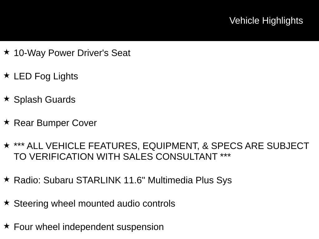 Subaru Certified Pre-Owned, EyeSight Driver-Assist System, X-Mode: Traction Management System, LED Steering Responsive Headlights (SRH), Apple CarPlay & Android Auto, SiriusXM Radio Capable, All-Weather Package (Heated Seats, Heated Mirrors, Wiper De-Icer), Blind Spot Detection (BSD), Bluetooth, Rear Vision Camera, Integrated Roof Rack System, Adaptive Cruise Control, High Beam Assist (HBA), Dual-Zone Auto Climate Control, Push-Button Start, Power Rear Tailgate, 10-Way Power Driver's Seat, LED Fog Lights, Splash Guards, Rear Bumper Cover, *** ALL VEHICLE FEATURES, EQUIPMENT, & SPECS ARE SUBJECT TO VERIFICATION WITH SALES CONSULTANT ***, 4-Wheel Disc Brakes, Four wheel independent suspension, Radio: Subaru STARLINK 11.6" Multimedia Plus Sys, Steering wheel mounted audio controls, Wheels: 17" x 7J Black Aluminum-Alloy.