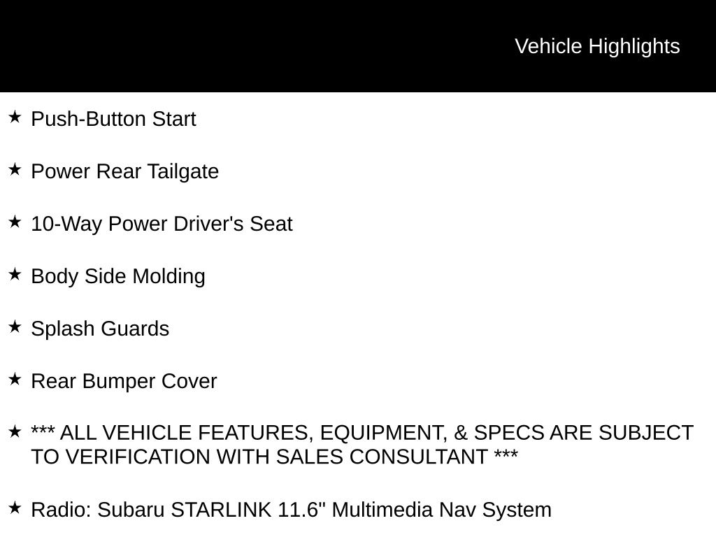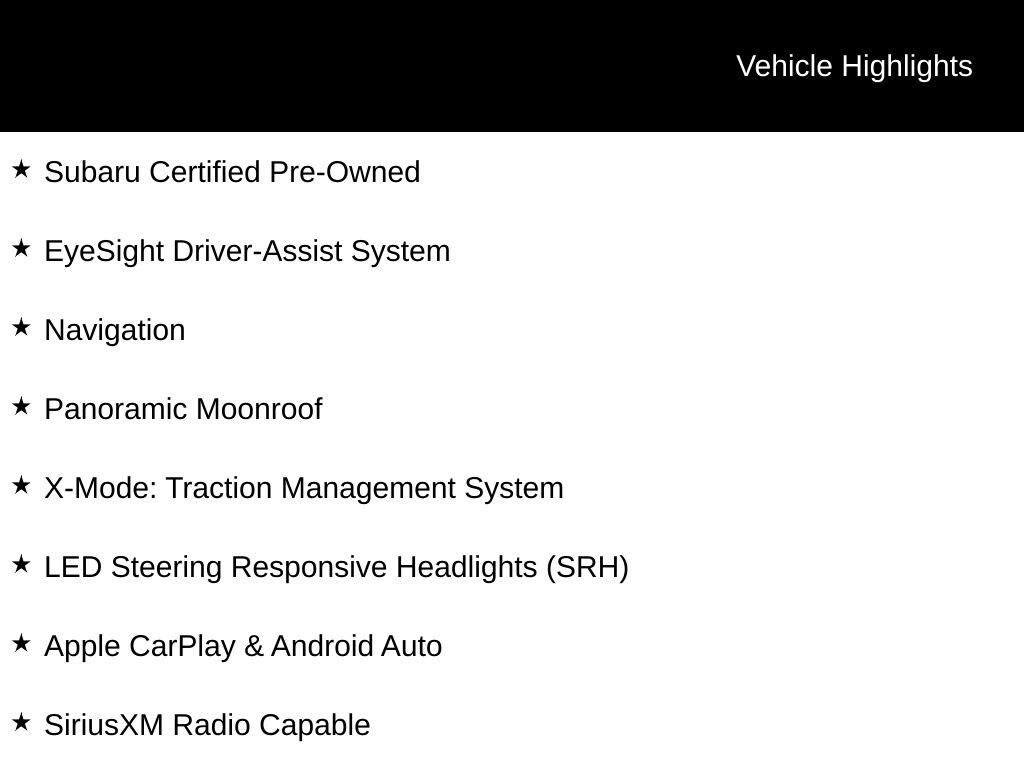 Subaru Certified Pre-Owned, EyeSight Driver-Assist System, Navigation, Panoramic Moonroof, X-Mode: Traction Management System, LED Steering Responsive Headlights (SRH), Apple CarPlay & Android Auto, SiriusXM Radio Capable, All-Weather Package (Heated Seats, Heated Mirrors, Wiper De-Icer), Blind Spot Detection (BSD), Bluetooth, Rear Vision Camera, Integrated Roof Rack System, Adaptive Cruise Control, High Beam Assist (HBA), Dual-Zone Auto Climate Control, Push-Button Start, Power Rear Tailgate, 10-Way Power Driver's Seat, Body Side Molding, Splash Guards, Rear Bumper Cover, *** ALL VEHICLE FEATURES, EQUIPMENT, & SPECS ARE SUBJECT TO VERIFICATION WITH SALES CONSULTANT ***, 4-Wheel Disc Brakes, Four wheel independent suspension, Radio: Subaru STARLINK 11.6" Multimedia Nav System, Steering wheel mounted audio controls, Wheels: 17" x 7J Black Aluminum-Alloy.