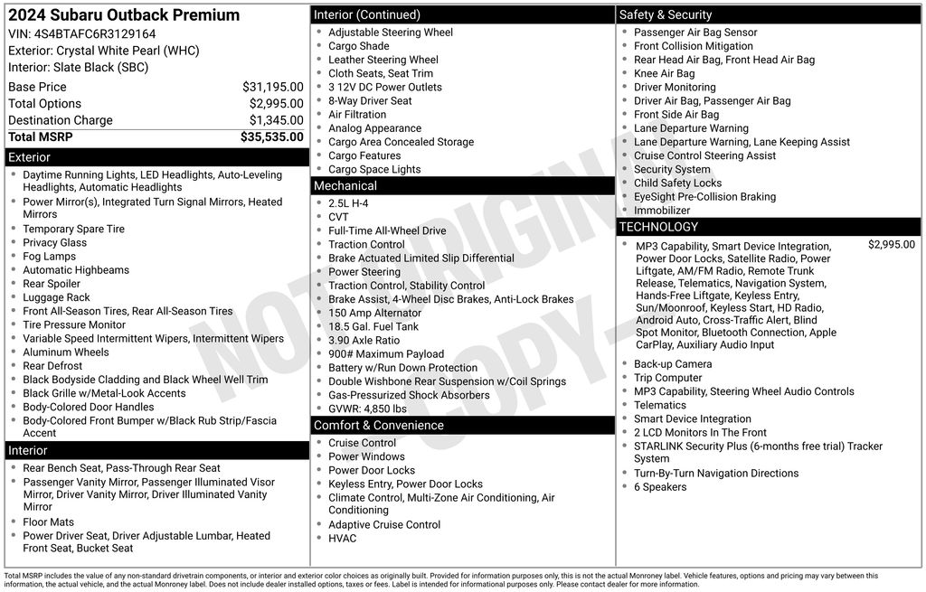Oliver Subaru of Rutland is proud to present you with another True Market Priced Pre-Owned Vehicle. This 2024 Subaru Outback Premium Subaru Certified Pre-Owned is loaded with the following Factory Options: 4-Wheel Disc Brakes, Four wheel independent suspension, Radio: Subaru STARLINK 11.6" Multimedia Nav System, Steering wheel mounted audio controls, and Wheels: 17" x 7J Black Aluminum-Alloy BSD & RCTA & Keyless Access & Push Button Start (Radio: Subaru STARLINK 11.6" Multimedia Nav System, Blind Spot Detection (BSD), Hands-Free Power Rear Gate, Keyless Access w/Push Button Start, Power Moonroof, and Rear Cross Traffic Alert (RCTA)), 4-Wheel Disc Brakes, Four wheel independent suspension, Steering wheel mounted audio controls, Wheels: 17" x 7J Black Aluminum-Alloy, 6 Speakers, ABS brakes, Air Conditioning, Alloy wheels, AM/FM radio: SiriusXM, Auto High-beam Headlights, Automatic temperature control, Brake assist, Cloth Upholstery, Driver door bin, Driver vanity mirror, Dual front impact airbags, Dual front side impact airbags, Electronic Stability Control, Emergency communication system: STARLINK Safety Plus (3-year free trial), Exterior Parking Camera Rear, Front anti-roll bar, Front Bucket Seats, Front Center Armrest w/Storage, Front dual zone A/C, Front fog lights, Front reading lights, Fully automatic headlights, Heated door mirrors, Heated Front Bucket Seats, Heated front seats, Illuminated entry, Knee airbag, Leather Shift Knob, Leather steering wheel, Low tire pressure warning, Occupant sensing airbag, Outside temperature display, Overhead airbag, Overhead console, Panic alarm, Passenger door bin, Passenger vanity mirror, Power door mirrors, Power driver seat, Power steering, Power windows, Radio: Subaru STARLINK 11.6" Multimedia Plus Sys, Rear anti-roll bar, Rear seat center armrest, Rear window defroster, Rear window wiper, Remote keyless entry, Roof rack, Security system, Speed control, Speed-sensing steering, Split folding rear seat, Spoiler, Tachometer, Telescoping steering wheel, Tilt steering wheel, Traction control, Trip computer, Turn signal indicator mirrors, and Variably intermittent wipers!!