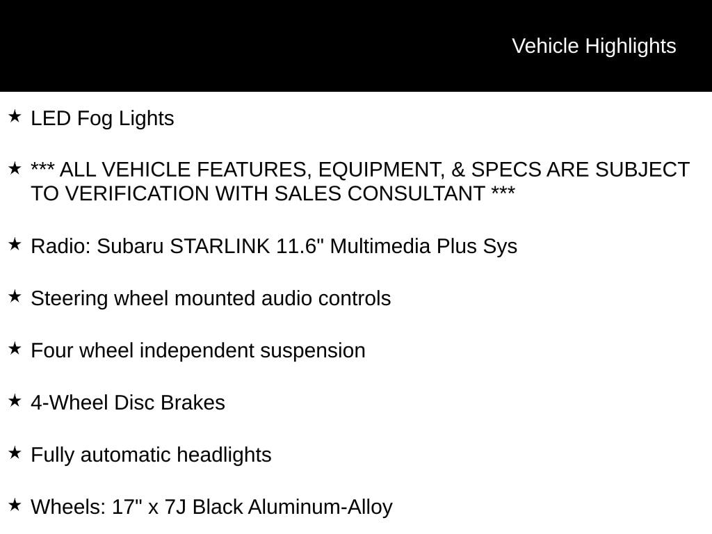 EyeSight Driver-Assist System, X-Mode: Traction Management System, LED Steering Responsive Headlights (SRH), Apple CarPlay & Android Auto, SiriusXM Radio Capable, All-Weather Package (Heated Seats, Heated Mirrors, Wiper De-Icer), Blind Spot Detection (BSD), Bluetooth, Rear Vision Camera, Integrated Roof Rack System, Adaptive Cruise Control, High Beam Assist (HBA), Dual-Zone Auto Climate Control, Push-Button Start, Power Rear Tailgate, 10-Way Power Driver's Seat, LED Fog Lights, *** ALL VEHICLE FEATURES, EQUIPMENT, & SPECS ARE SUBJECT TO VERIFICATION WITH SALES CONSULTANT ***, 4-Wheel Disc Brakes, Four wheel independent suspension, Fully automatic headlights, Radio: Subaru STARLINK 11.6" Multimedia Plus Sys, Steering wheel mounted audio controls, Wheels: 17" x 7J Black Aluminum-Alloy.