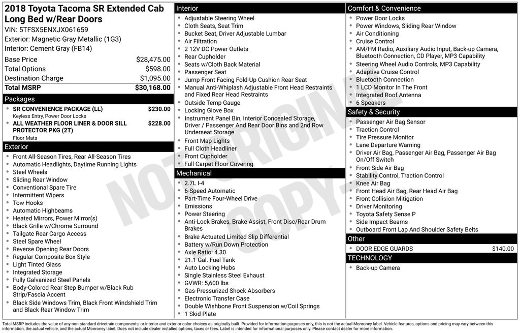 2018 Toyota Tacoma SR 4D Access Cab SR 2.7L I4 DOHC 16V 6-Speed Automatic 4WD
