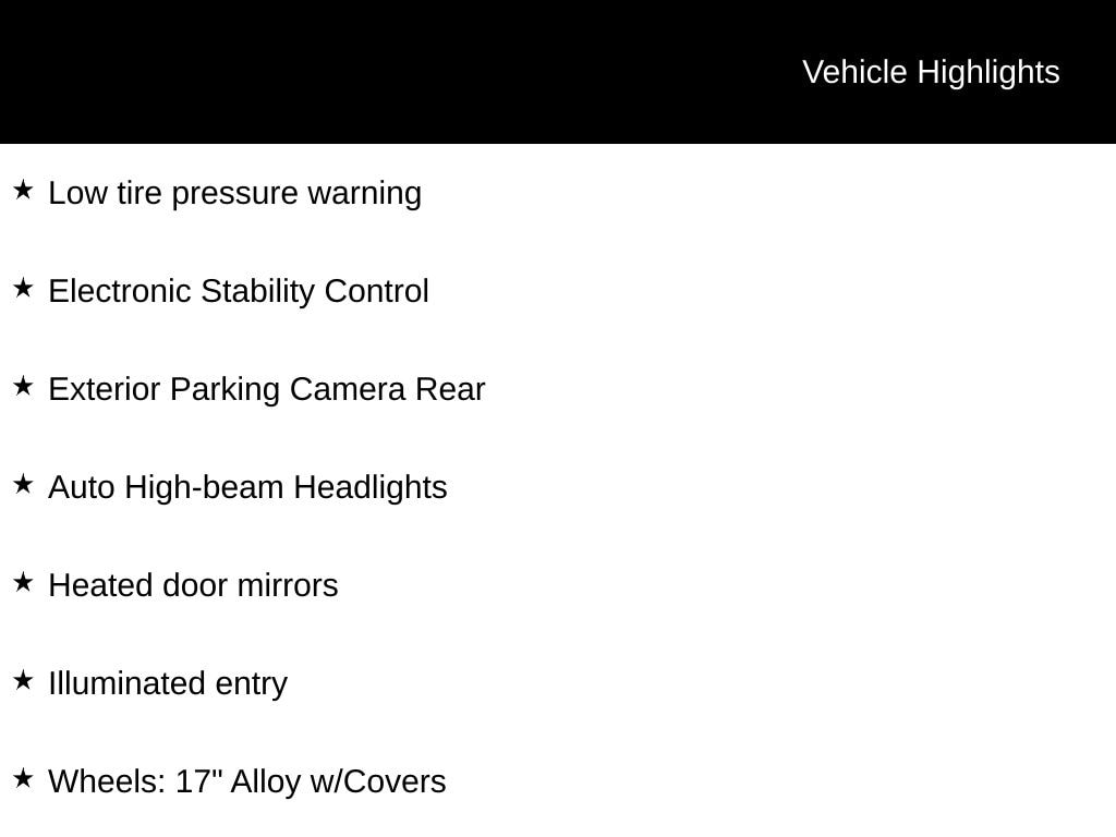 Bluetooth, Auto Climate Control, Push-Button Start, Power Rear Tailgate, 2.0L 4-Cylinder DOHC 16V VVT, ABS brakes, Auto High-beam Headlights, Electronic Stability Control, Exterior Parking Camera Rear, Heated door mirrors, Illuminated entry, Low tire pressure warning, Remote keyless entry, Steering wheel mounted audio controls, Traction control, Wheels: 17" Alloy w/Covers.