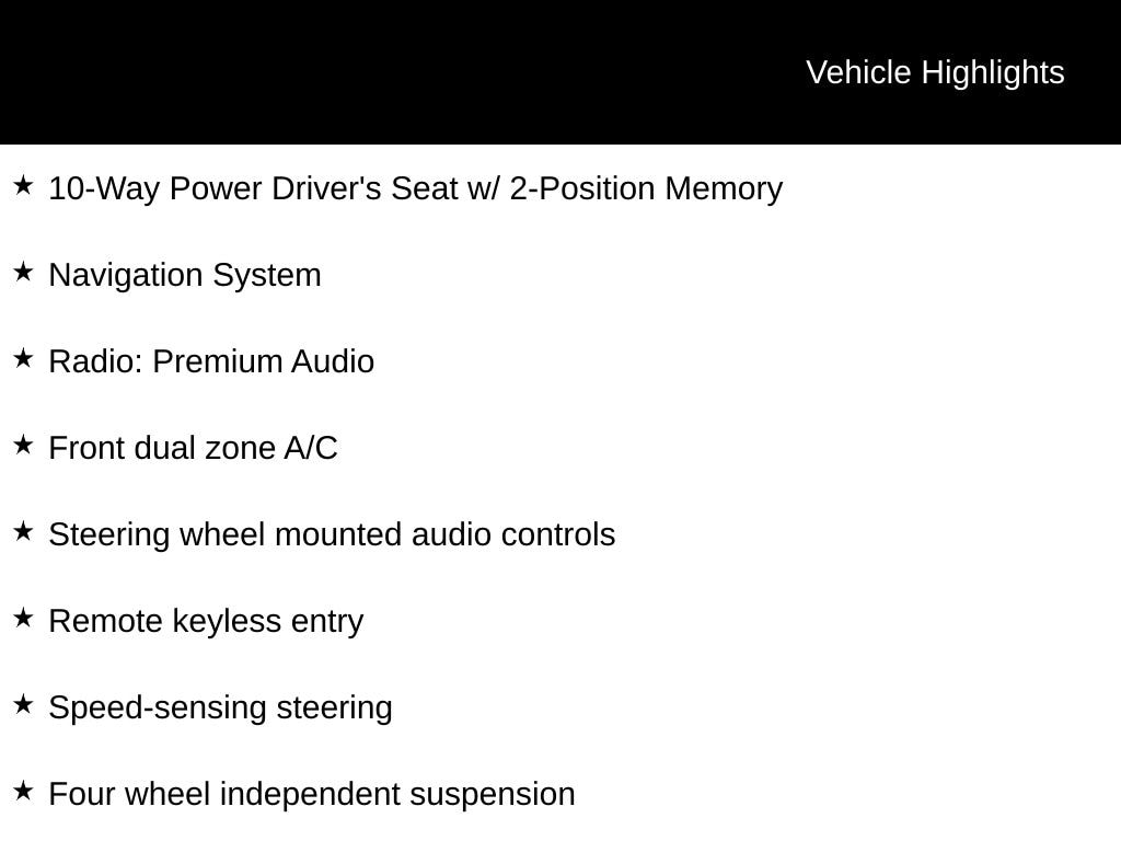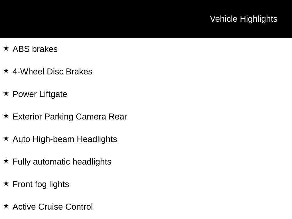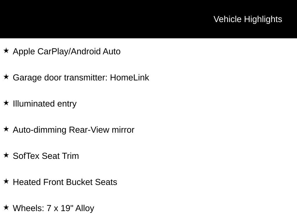 10-Way Power Driver's Seat w/ 2-Position Memory, AWD, 4-Wheel Disc Brakes, ABS brakes, Active Cruise Control, Apple CarPlay/Android Auto, Auto High-beam Headlights, Auto-dimming Rear-View mirror, Exterior Parking Camera Rear, Four wheel independent suspension, Front dual zone A/C, Front fog lights, Fully automatic headlights, Garage door transmitter: HomeLink, Heated Front Bucket Seats, Illuminated entry, Navigation System, Power Liftgate, Radio: Premium Audio, Remote keyless entry, SofTex Seat Trim, Speed-sensing steering, Steering wheel mounted audio controls, Wheels: 7 x 19" Alloy.