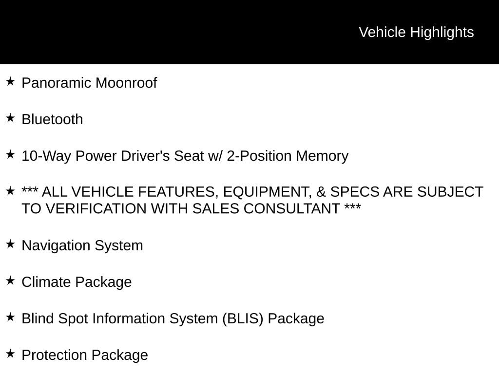 Panoramic Moonroof, Bluetooth, 10-Way Power Driver's Seat w/ 2-Position Memory, *** ALL VEHICLE FEATURES, EQUIPMENT, & SPECS ARE SUBJECT TO VERIFICATION WITH SALES CONSULTANT ***, AWD, 4-Wheel Disc Brakes, 8 Speakers, Auto-dimming Rear-View mirror, Blind Spot Information System (BLIS) Package, BLIS Blind Spot Information System, Cargo Tray, CD player, Climate Package, Four wheel independent suspension, Front & Rear Park Assist, Heated Front Seats, Heated Rear Seats, Heated Steering Wheel, Heated Windshield, Heated Windshield Washer Nozzles, Interior Air Quality System (IAQS), Navigation System, Premium audio system: Sensus Connect, Protection Package, Rain sensing wipers, Rear fog lights, Rubber Floor Mats, Steering wheel mounted audio controls, Wheels: 18" Pan Alloy.